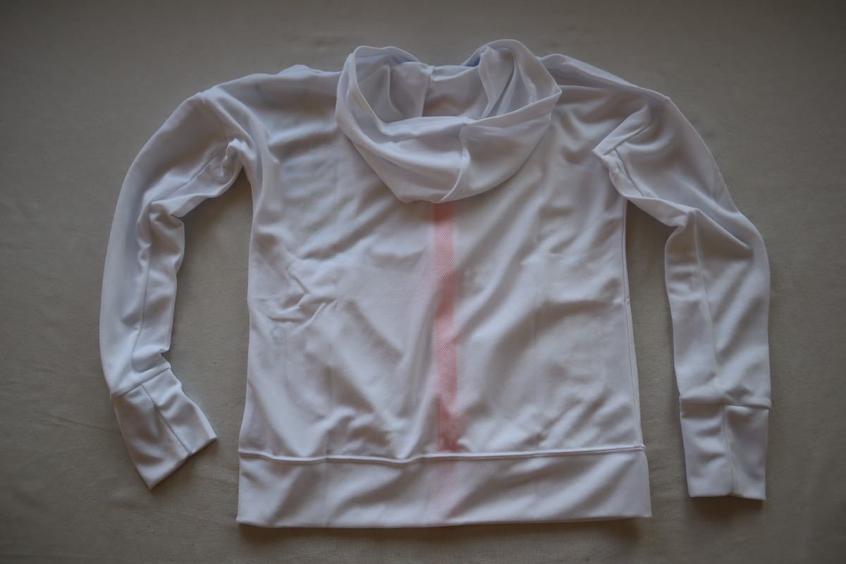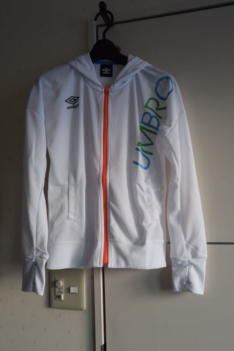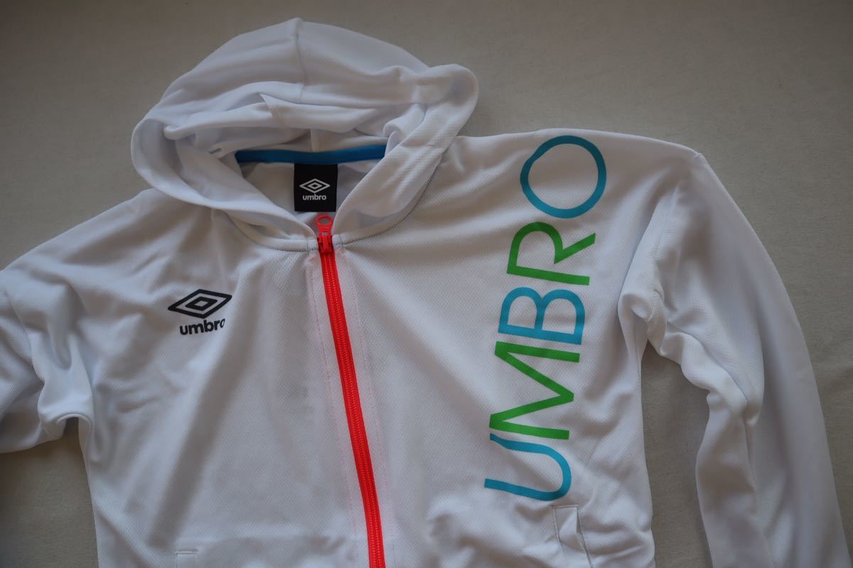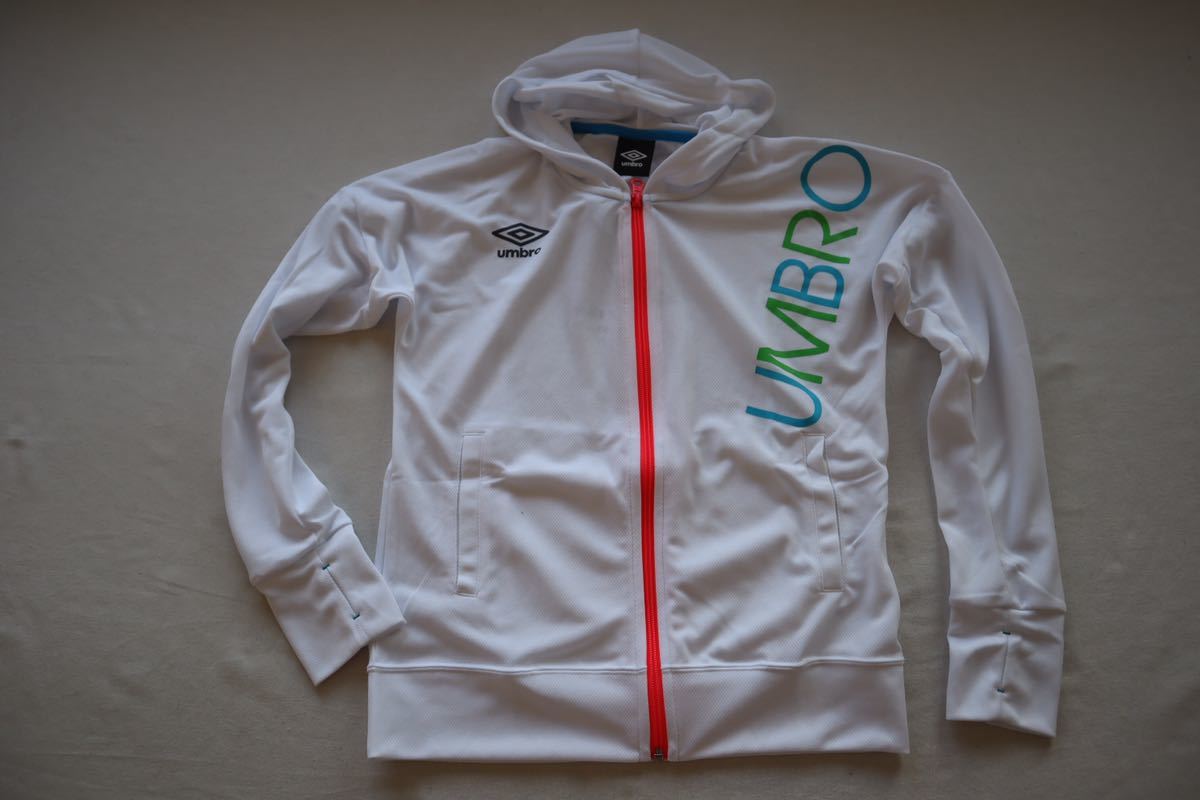 【CLOUR×UMBRO】シリーズ。吸汗性のある生地を採用。前身に大胆に配置したマルチカラーのワードロゴが特徴のFDDジャケット。UVカット性に優れる。