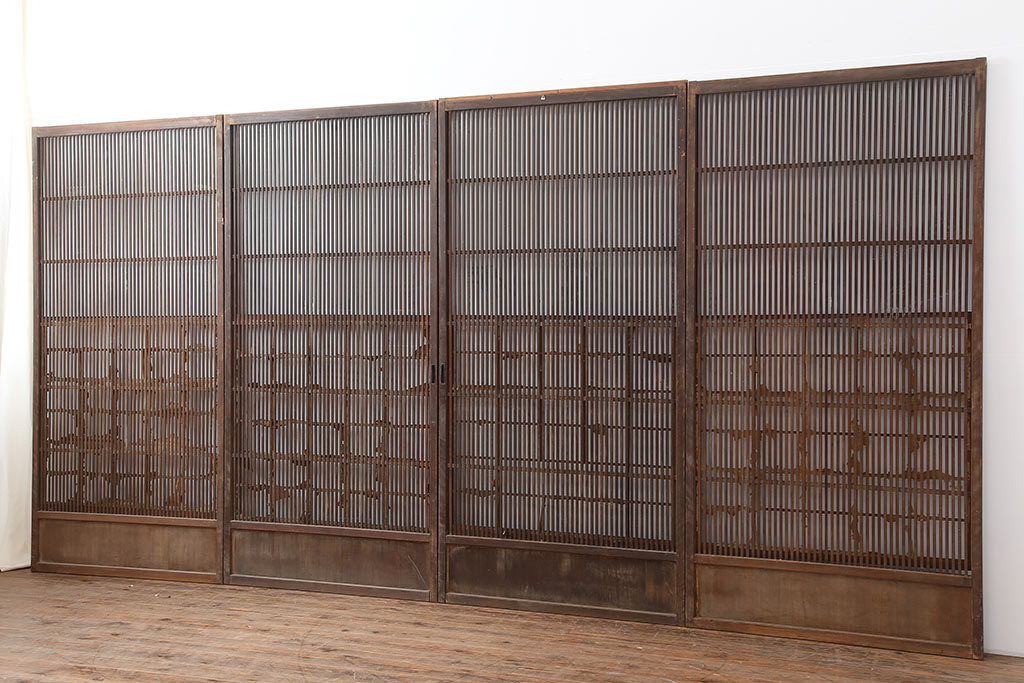R-043940 アンティーク建具 大正期 激レア!スライド式の障子が付いた格子戸4枚セット(引き戸、障子戸)(R-043940)