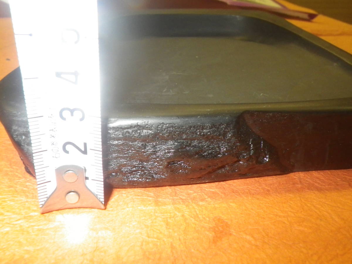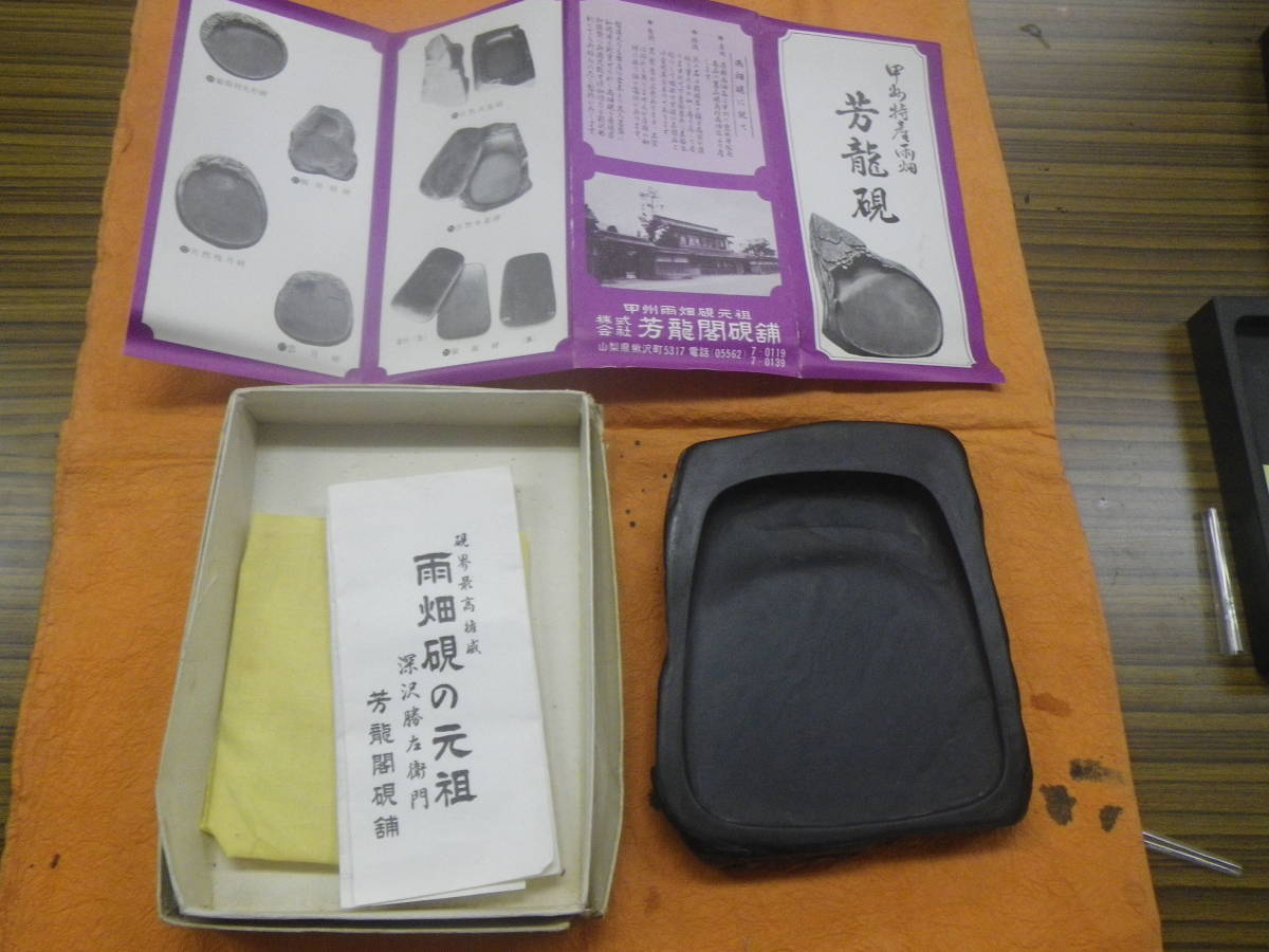 書道専門家向 雨畑硯  蔵出  貴重 30年前以上 デットストック物  雨畑硯の元祖芳龍閣 一番良い状態の時代の一品 雨畑真石は山梨県南巨摩郡早川町雨畑地方で現存する唯一の「坑道」から採れる硯石現在、緻密な粘板岩で粒子が細かく、水持ちがよい硯に最適な石質と評されています。水分の吸収が少ないため、彫った石に水を入れると普通は数時間で浸透してなくなりますが、雨畑真石においては一晩おいてもまだ水が残っているほどです 未使用ですが箱等、付属品傷みがあります、納得できる方のみ入札ください