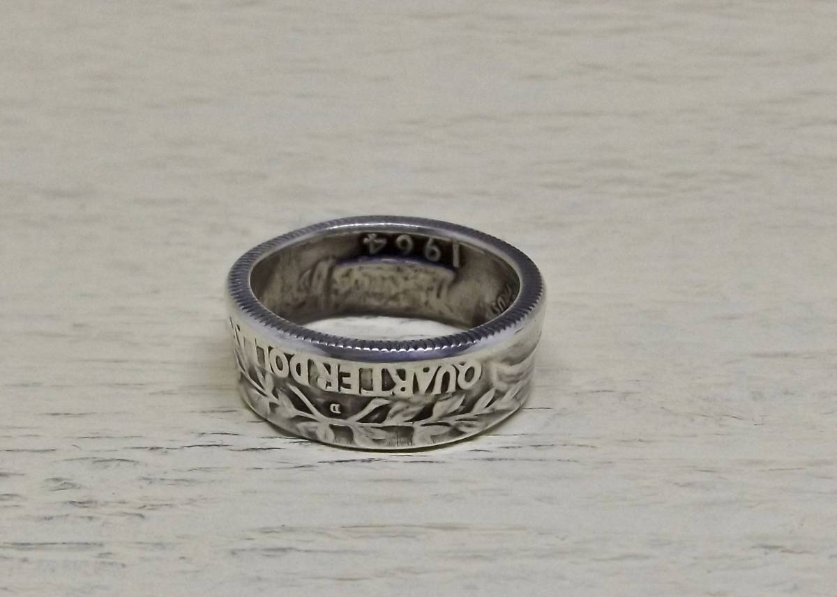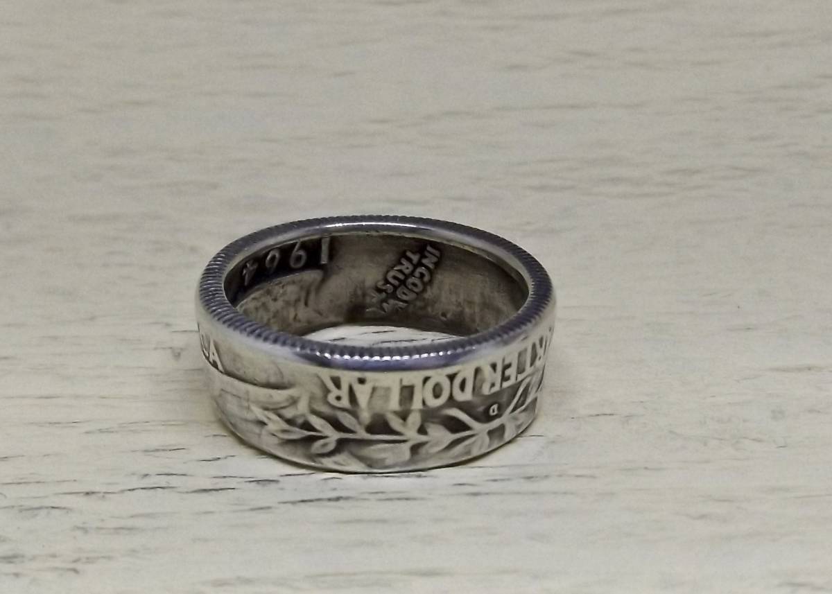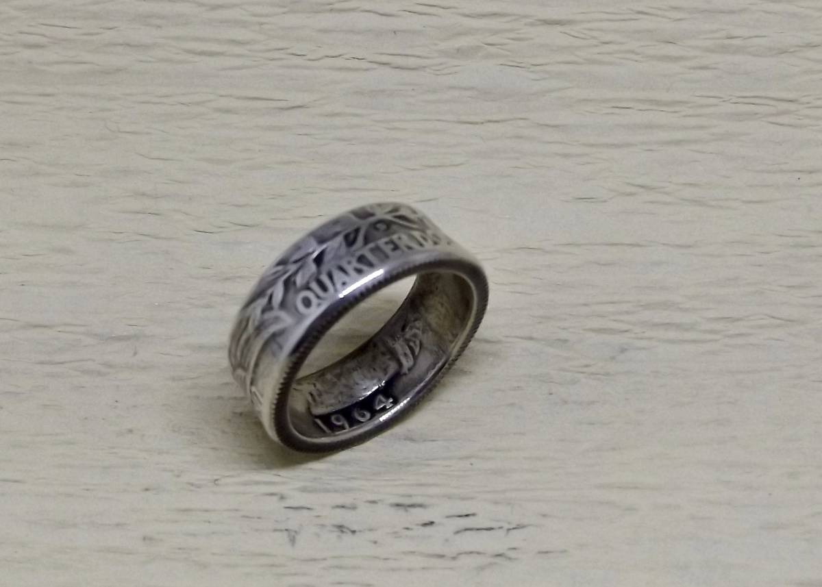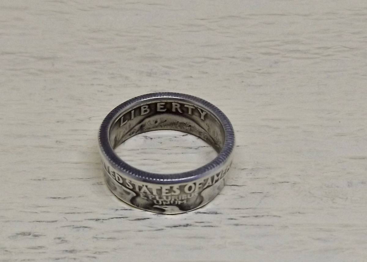 この商品は、1964年の25セント銀貨を使い、ハンドメイドにより作成     銀貨に穴を明け  木槌で叩いてコインリングに成形した1点物です。LIBERTY INCODWE TRUST ワシントンの肖像 UNITED STATES OF AMERICA