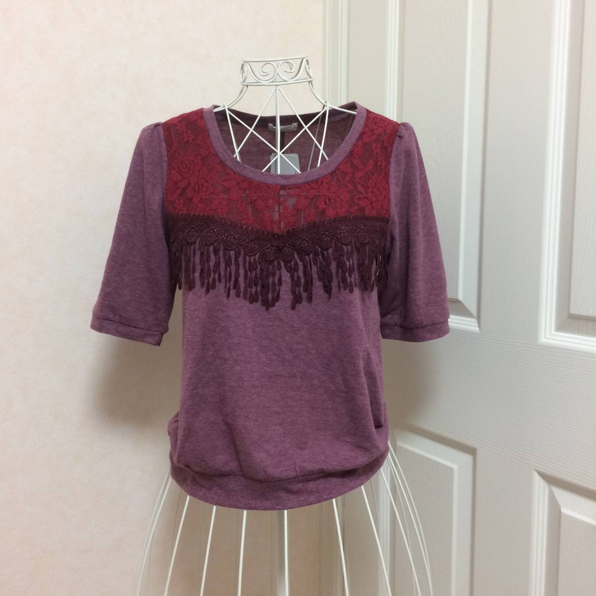新品 axes femme レースフリンジトップス★アクシーズファム ブランド 未使用 プルオーバー 半袖 ワイン色 クラシック