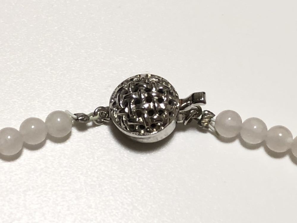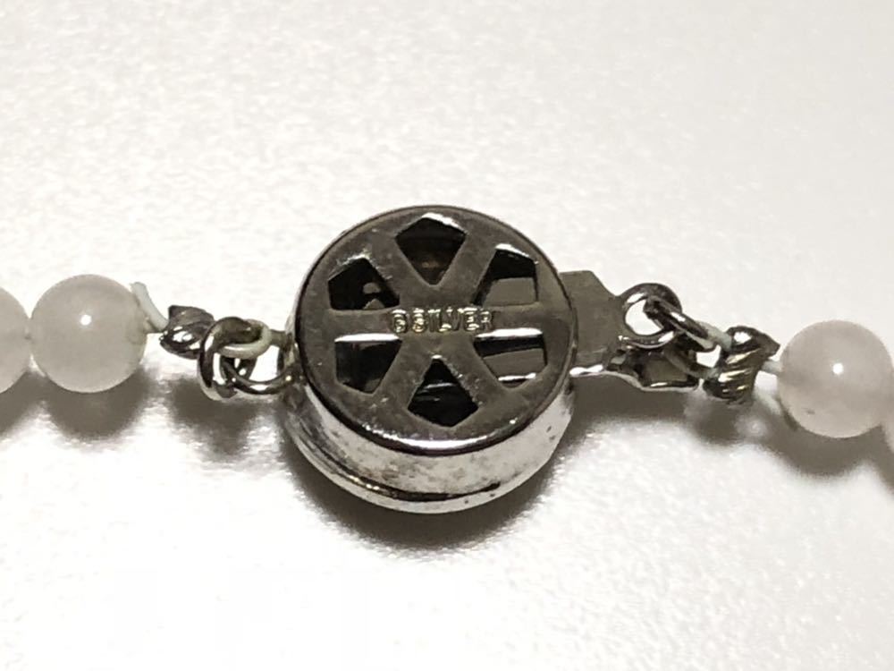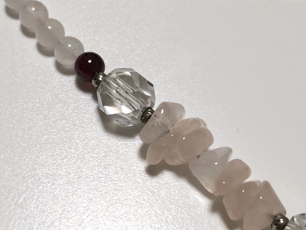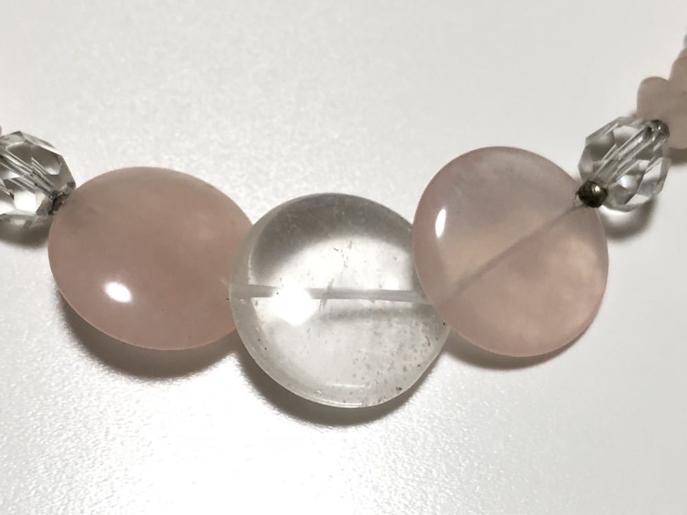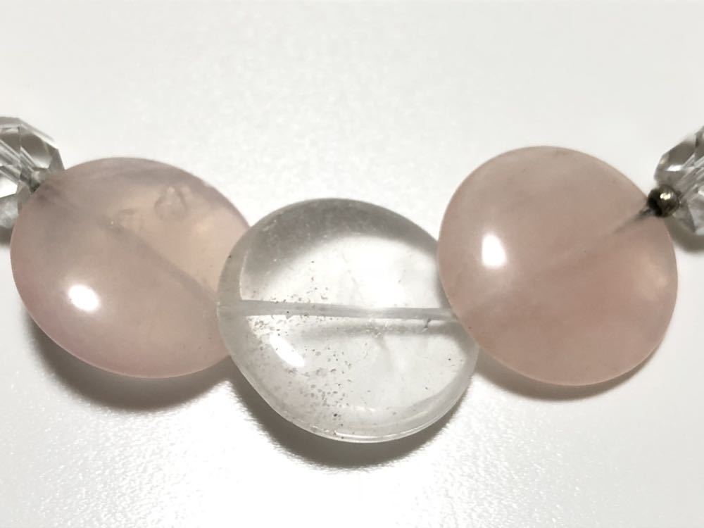 ローズクォーツ、本水晶、アメジストを使用した、フラットサークルカットのデザインペンダントネックレスです。金具部分には、GSILVERの刻印があります。金属面に若干のくすみがあります。