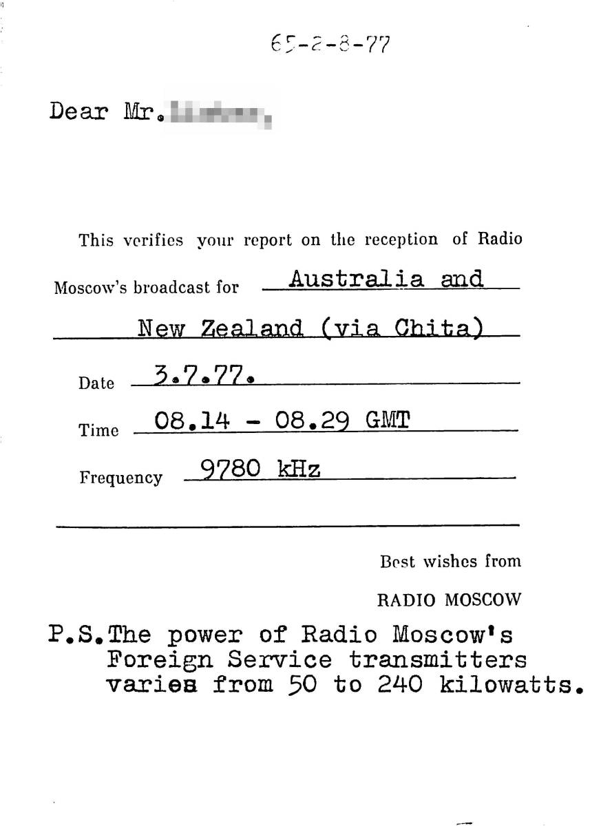 | 【商品名】・・・RADIO MOSCOW(★ラジオ・モスクワ)のベリカード。 【国名・地名】・・・ロシア(旧ソ連)・首都 モスクワ。 【受信データ】・・・1977年7月3日・SW9780KHZを受信。 【記載事項】・・・受信データ・受信者の氏名が記載。 【コメント】・・・旧ソビエト連邦時代の貴重なベリカードです! 【状態】・・・シワ、汚れ、シミ、焼け、色あせ等があります。 ■カードの状態は★画像を参考に判断して下さい。 ■この機会にぜひこのベリカードを貴方のBCLコレクションに加えて下さい! 【おまけ】・・・SONY・取扱説明書(PDF版)を1機種無料で添付します。 ★ハンディ受信機★ICF-PRO70のの取扱説明書。(★モノクロ) ★CD-Rに焼いてベリカードと一緒に同封致します。 ★PC閲覧やプリンターで印刷も可能です! | |