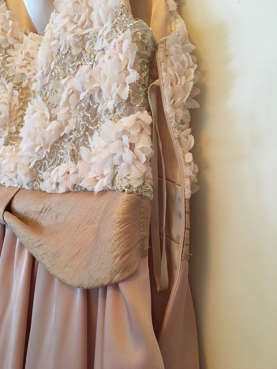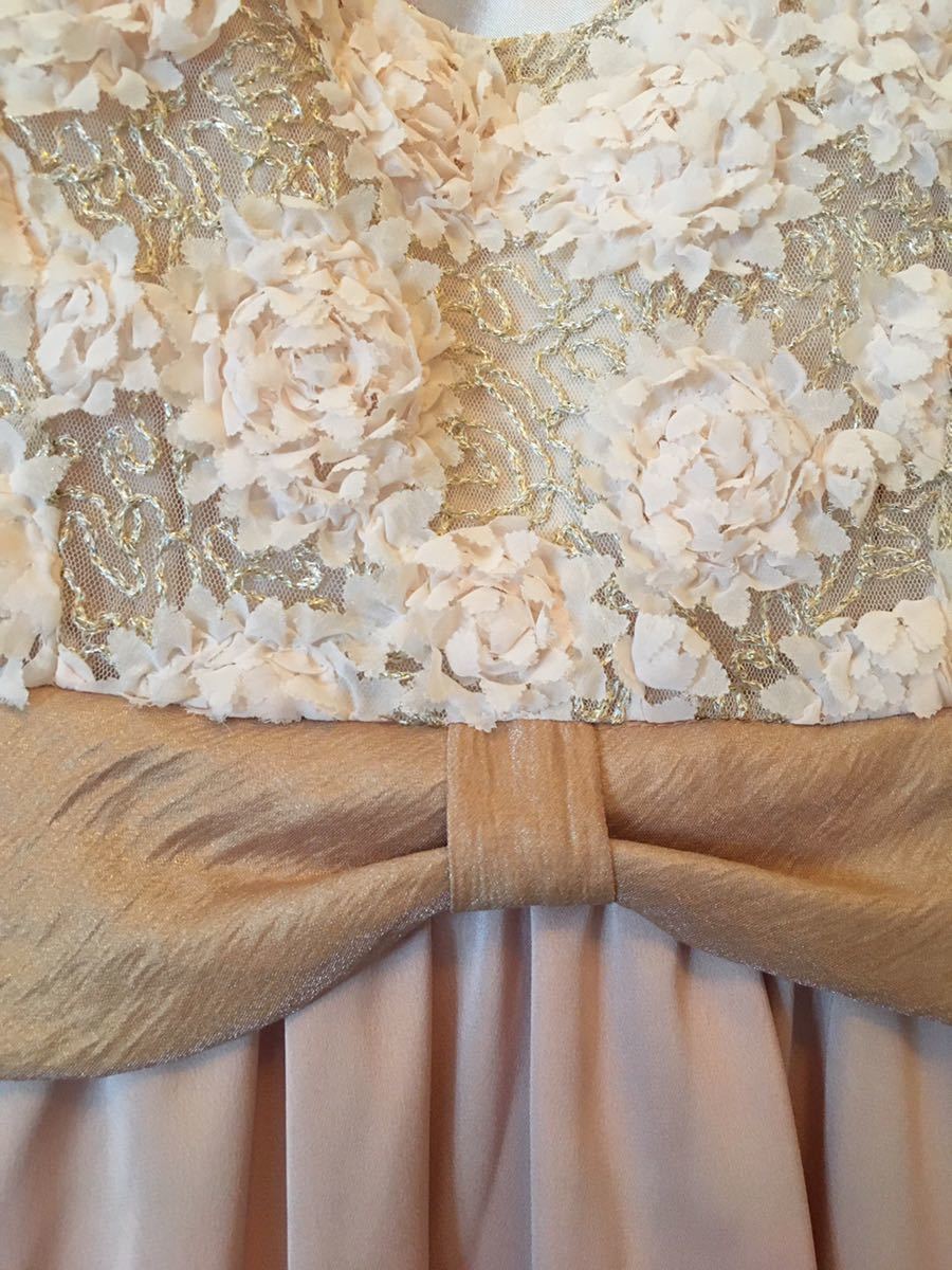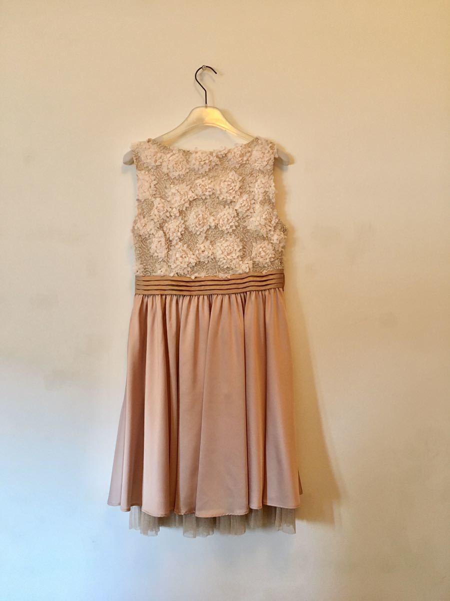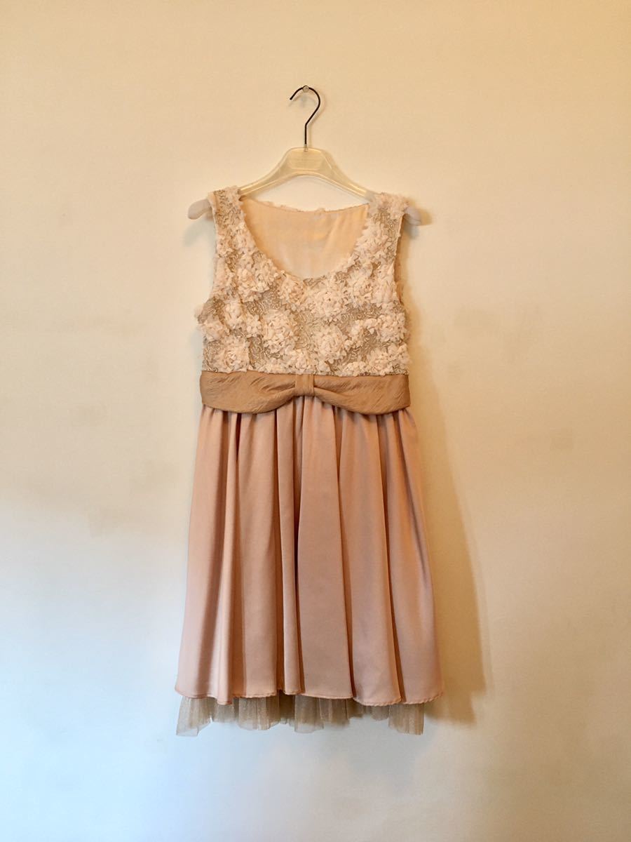 若い方向けのパーティードレス・ゲストドレス。結婚式や披露宴に。チュールの立体的なお花がついたトップスとベルト・スカートが一体型になったワンピース。アイボリー×ピンクベージュが上品で可愛いドレスです。一度のみ着用後、クリーニング済み。いつも同じゲストドレスは着れないし・・という時に!