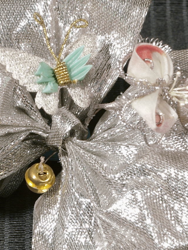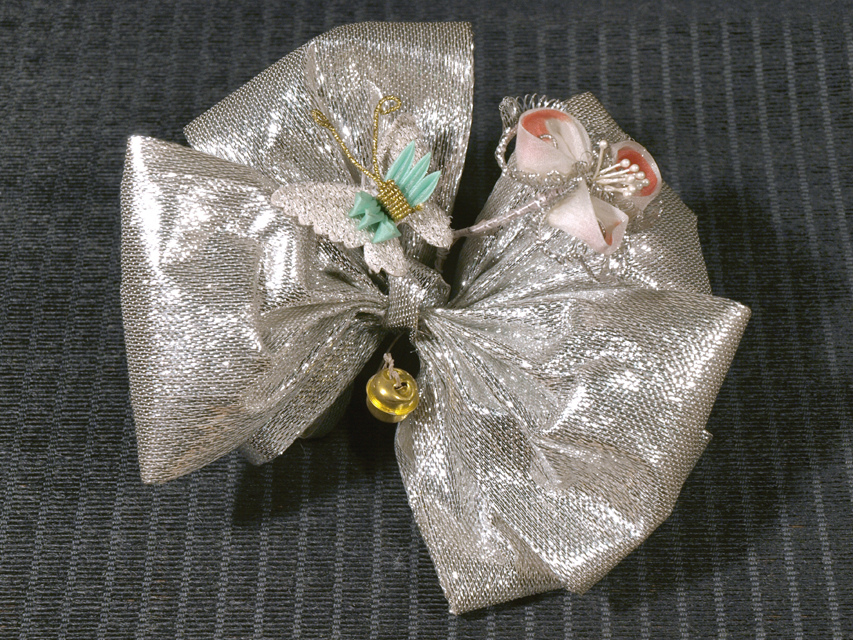 全体的な印象としては、銀色のリボンに、つまみ細工の花と蝶に鈴があしらわれた髪飾りです。ヘアピンが付いています。 ユーズド品です。アンティークに近いお品で、若干のくすみがあるほか、ヘアピン部分のところどころに錆(さび)と変色があります。そのほかに目につくしみやよごれ、褪色などのダメージはありません。 |