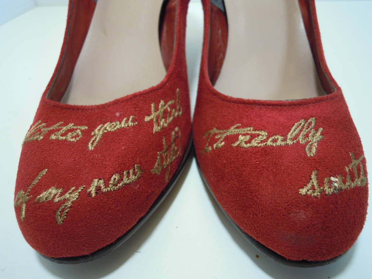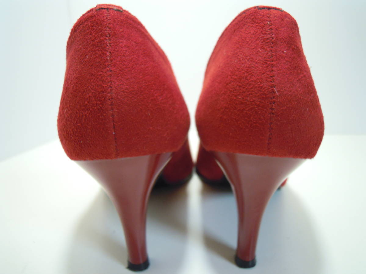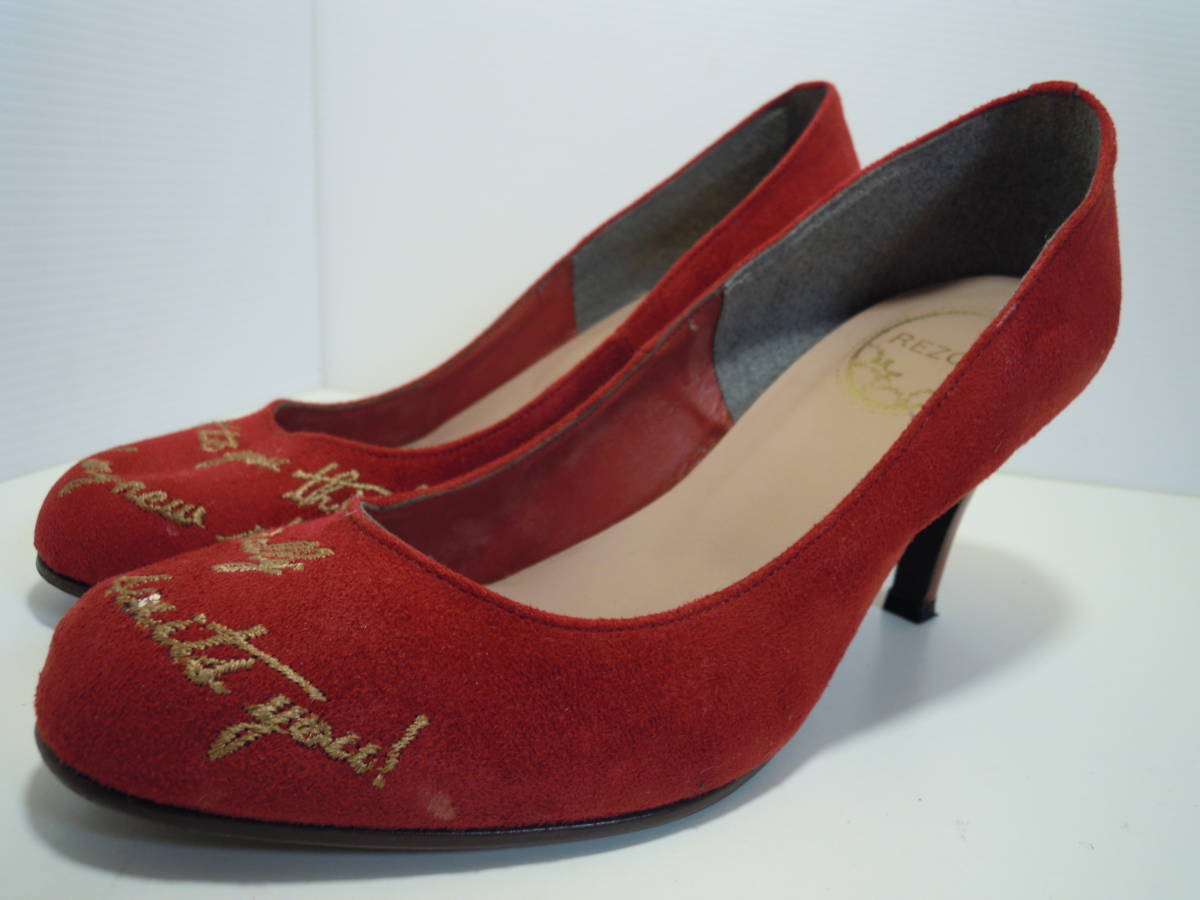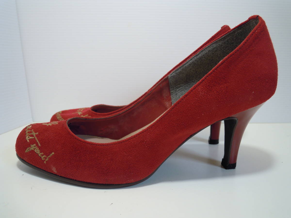 【ブランド・形態】 REZOY リゾイ 英字刺繍入り ラウンドトゥパンプス サイズ22.0cm 日本製です。 【カラー】 レッド/ゴールドです。 掲載の実物写真はPC環境や光の加減により実物と色合いが若干異なる場合があります。 【特徴】 REZOY リゾイの洗練されたシルエットが魅力のパンプスです。 アッパーはスエードレザーに、ゴールドの英字が刺繍されており、なかなか無いデザインです。 知的な雰囲気ただようエレガントなデザインは、オンオフ問わず幅広いシーンに活躍してくれます。 程よい高さのヒールは、思ったより安定感があって歩きやすく、履き心地、歩きやすさも良好です。 スカートやパンツ、どんなボトムとのコーディネートも合わせやすいです。 ヒール高さ:約7.0cm、最大幅:約7.8cm 【状態】 少々使用感はございますが、特に目立つダメージは見受けられず、使用に問題無いと思われます。 アッパーは比較的にきれいです。トップリフトは少しすり減りがあります。 内張りが一部がヒビが入りがれています。 保管箱はありません。 【材質】 アッパー:レザー アウトソール:合成底 【サイズ】 22.0cm、 質量:325g | |||