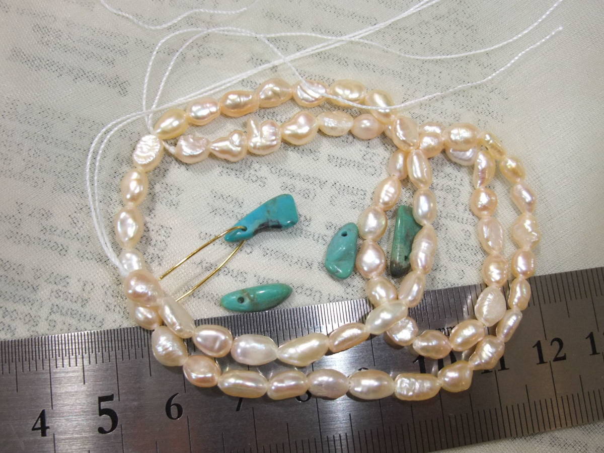 ピーチピンク系ライス芥子バロック淡水真珠連材と本ターコイズ☆(本トルコ石、アメリカ産も)クレオパトラルースセット95
