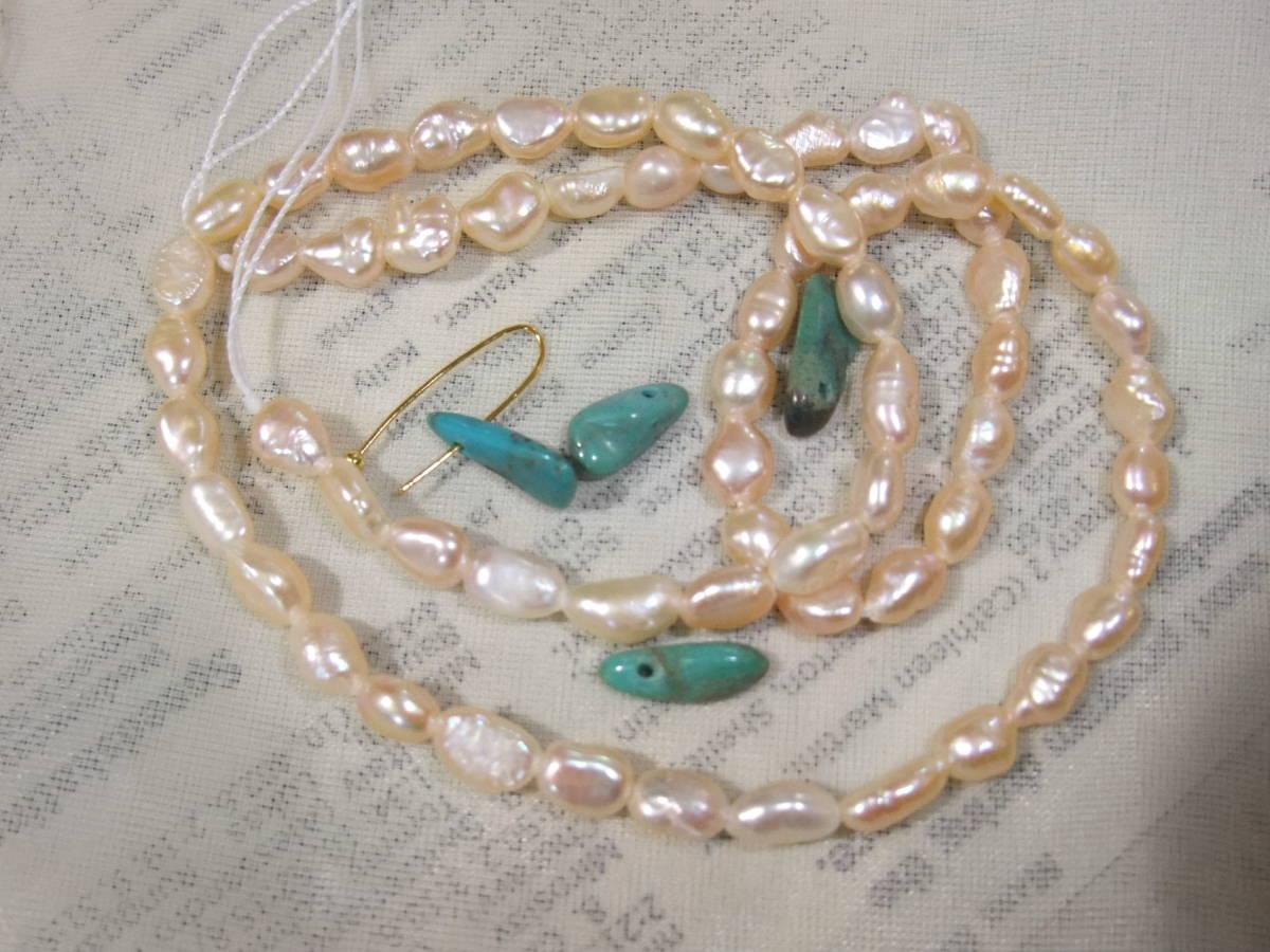 ややスレキズ等もありますが、概ねテリツヤ良いライスバロック真珠本物の淡水パールの連材1本と、ハネものではありますが本物のターコイズ(トルコ石)のクレオパトラタイプ(ルース上部の貫通両穴)のルースをセットしたお得なアソートです☆♪
