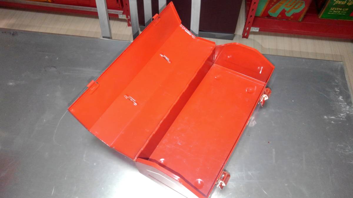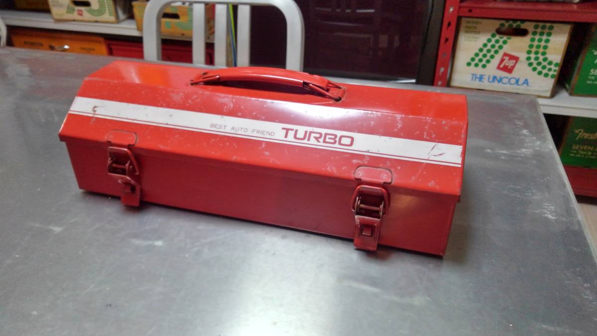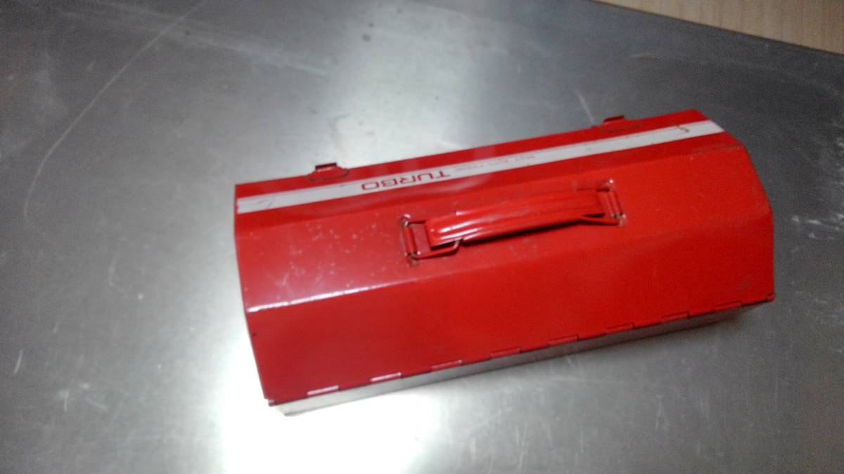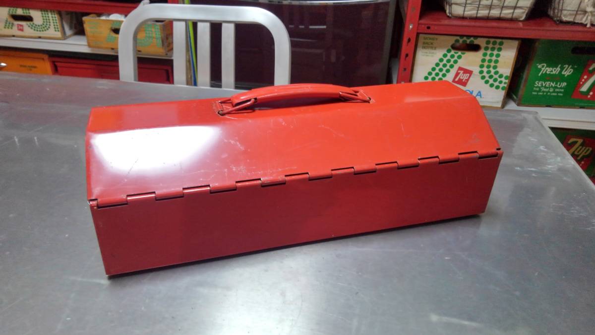 ビンテージのメタル工具箱です。自己紹介も御覧ください。持ち手除くサイズ約354×156×高さ105ミリ位です。工具箱多数出品中です。