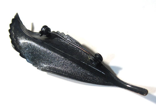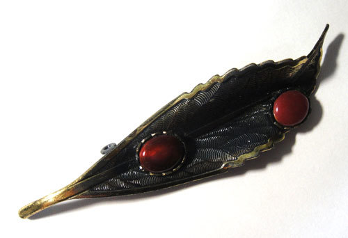 ■gs_945 昭和レトロ アンティーク コスチュームジュエリー ★ ブローチ 葉っぱ 彫刻 金色 赤 帯留にも