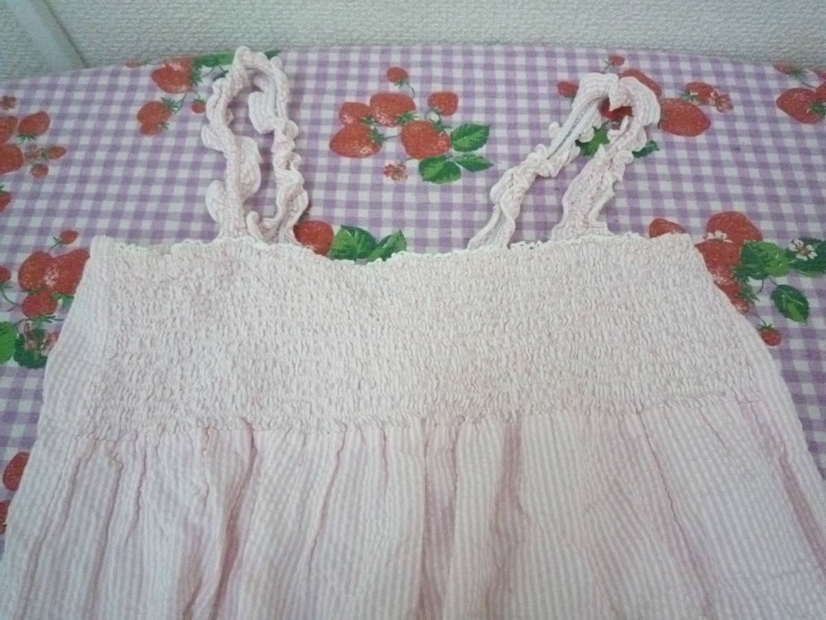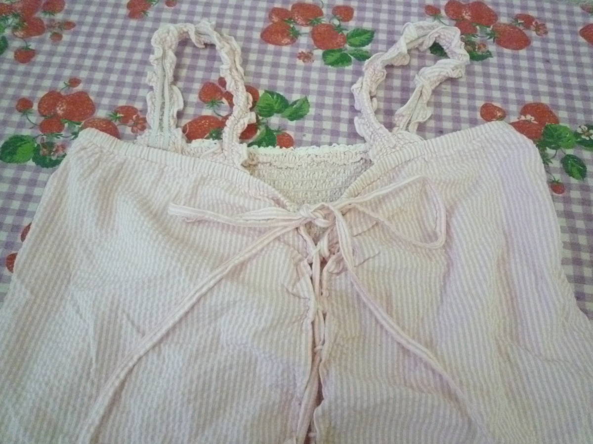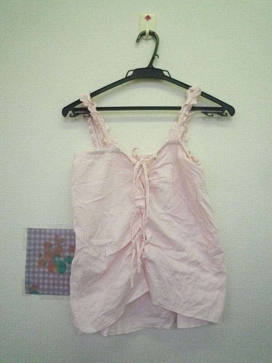 ★ C・O・L・Z・A かわいい キャミソール トップス シャーリング 編み上げ ストライプ シワ加工 ピンク <M> 綿100%