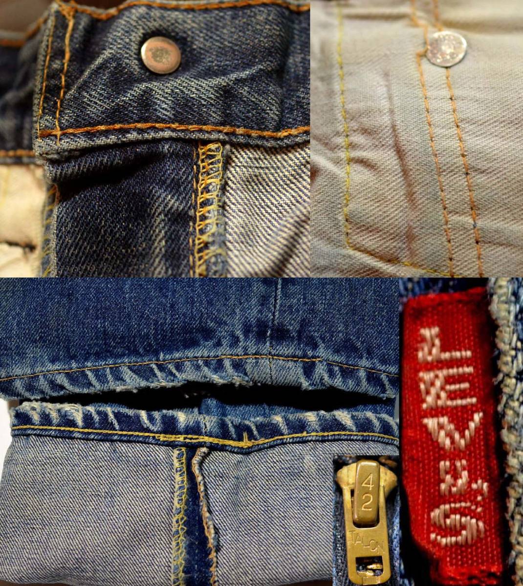☆商品チェックはしっかり時間を掛けて慎重に行っておりますが、古着として常識的範囲の色褪せ、ボタンホールの緩み、ステッチ切れ、スレキへの書き込み、臭い、細かいスレ・傷・汚れ等は記載を省略している事があります。☆ウエストの計測はヨレの無い状態で横幅×2、レングスは股下からインシームラインを真っ直ぐにして直線で計測しております。サイズがご心配な方は、 計測方法をご指定頂ければその通りに再計測します。☆ご使用のモニターなど環境によって色合いが違って見える場合がございます。☆入札の取り消しや、落札後のキャンセルなどは基本お受け出来ません。 ☆ノークレーム、ノーリターンを原則としてお願いしておりますが、客観的に完全に当方の落ち度である場合(40インチを30インチと記載するなど、明らかに誤差ではない大幅なサイズのミスなど)は誠意を持って対処させて頂きます。その場合、到着後3日以内に必ず取引ナビでご連絡下さい。 また、いきなり評価をされる場合は対応しません。☆新規IDの方は入札前に質問欄よりお問合せ下さい。☆イメージ違い等、主観によるクレームには対応できません。当方では出品から発送まで、状態・サイズなど何重にもチェックし、万全を心掛けています。入札者様のご協力がなければスムーズな取引は成立しませんので、ご入札前に再度サイズ(上記の計測方法で)や状態などをよくご確認ください。☆細心の注意をしておりますが、長期保管により、出品時よりパッチなどが劣化している場合があります。☆基本的に開始価格以下の取引は考えておりません。☆下取り、買取等のご相談もお受け致します。質問欄よりお問い合わせください。