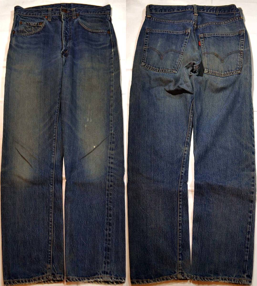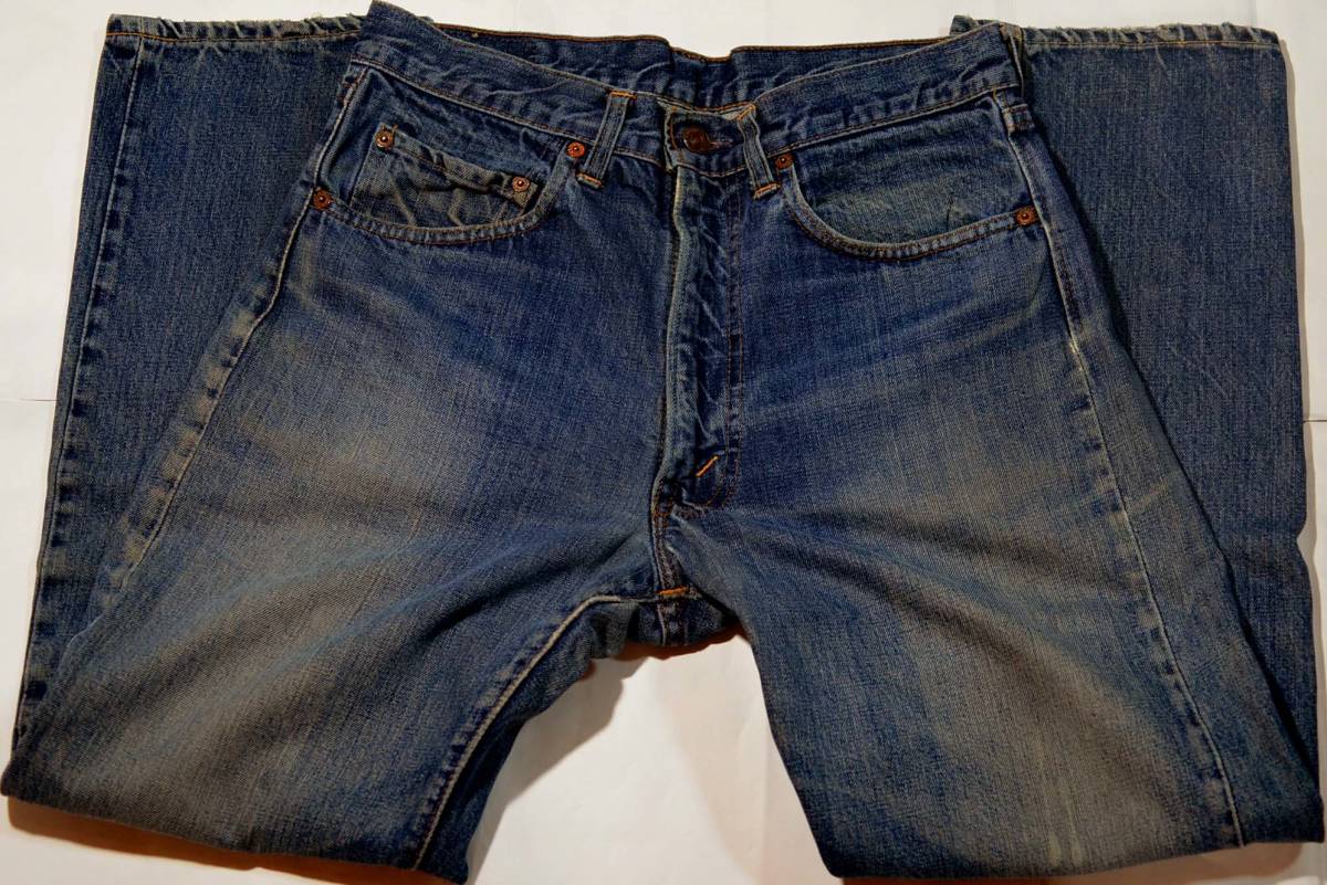 60'sの505ビッグEです。復刻、レプリカではありません。『ディテール紹介』フロントボタン裏の刻印8、タロン42ジッパー、裾オリジナルチェーンステッチ、フロントポケット、ベルトループ、 、ウエスト、ジッパー、パッチ、アウトシーム、裾など、イエロー綿糸は多数使用されています。バックポケット淵はシングルです。『状態』スレ、キズなど(左ヒザに5ミリぐらいの 極小スレ、裾にスレなど)USED感があります。 生地はしっかりしており、この年代のヴィンテージとして程度良好です。『色落ち、特徴など』グッドサイズ・程度良好の505Eです。 全体に綺麗な縦落ちが走り、濃淡のメリハリも出ています。 ビッグEらしい良い色落ちだと思います。オリジナルレングスの少し短めで、お探しの方も多いと思います。 裾幅18㎝なので、スリムに近い感覚で穿けると思います。