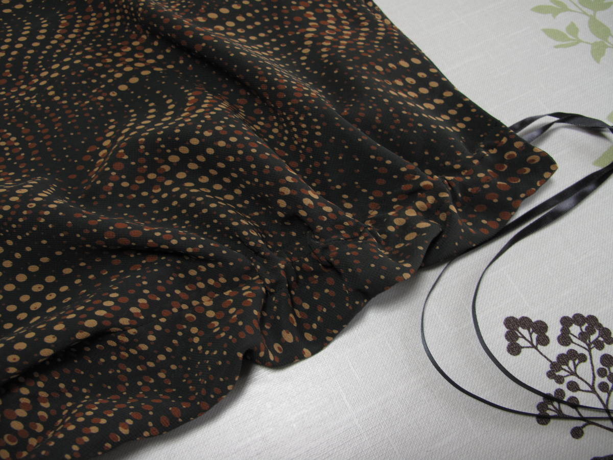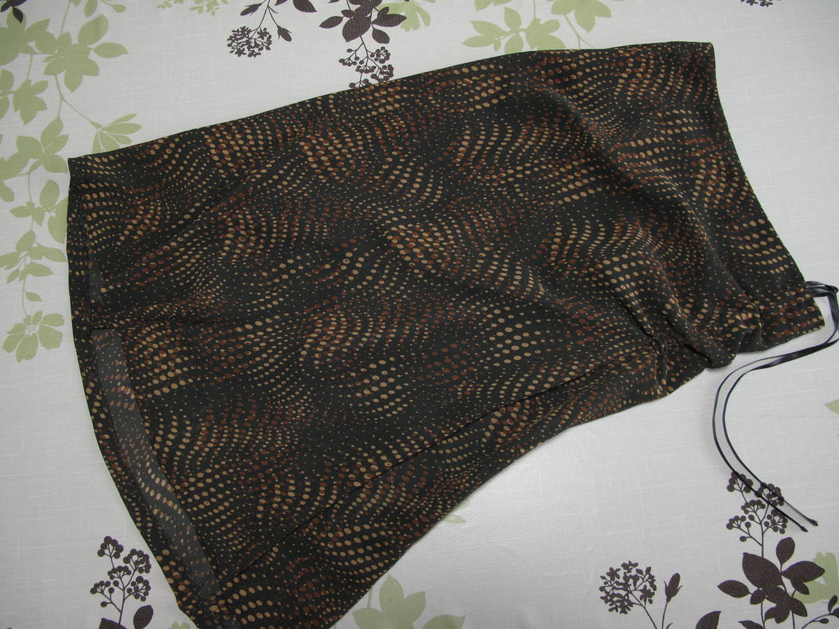 右寄りの部分を内側のテープリボンで絞って調節して、スカートのラインをアシメントリーな感じに変えることができます。(3枚目の写真でご確認ください。)
