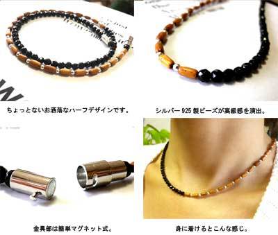 ちょっとないお洒落なハーフデザインが特徴的なマグネット式ネックレス。 人気のオニキス、天然のリンデンウッド、更にシルバー925製ビーズを採用。 季節問わず、背伸びもしない、毎日のデイリーファッションに最適です。 |