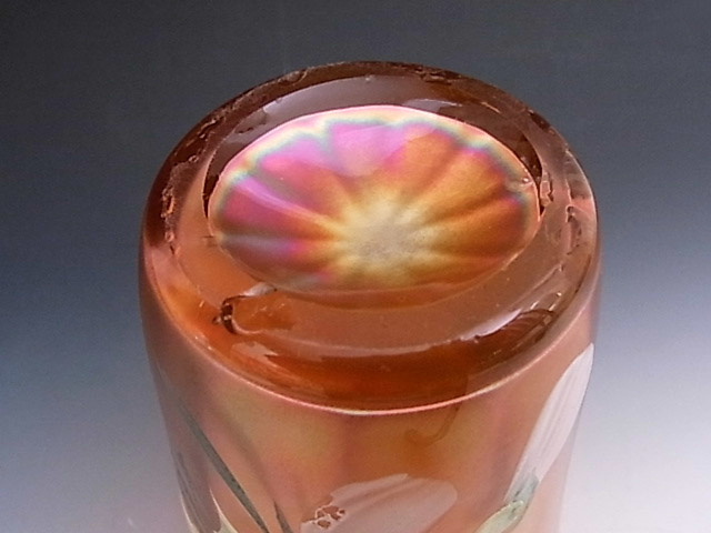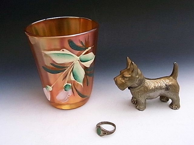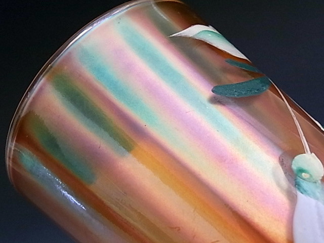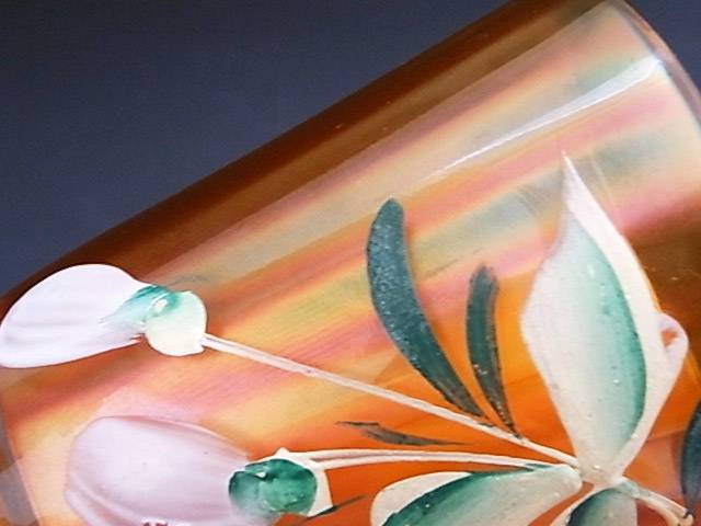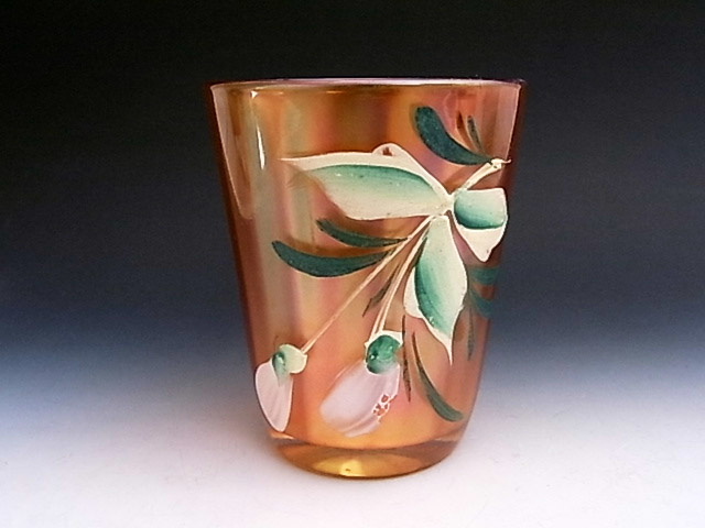 画像でお分かりのようにオレンジ色ラスターのレトロな米国製花絵グラスです。 厚めに塗られた花絵も大変素敵ですが、見どころは何と言っても底から湧き上がるようなバブルが魅力の作品です。 光の当て方によってオレンジ色にグリーンが浮き上がるのも趣があります。 状態は底にいくつかの小ソゲがある以外ほぼ完全美品です。 年代は作風より1900年代初頭の作品です。 大きさは直径が8cm、縁からの高さが10cm あります。 送料は2500円頂きます。 お支払いはYahoo!かんたん決済、または銀行振込みでお願いします。 ご入金確認後2日以内にアメリカより航空便でお送りいたします。 発送後通常4~10日でお届けいたします。 複数品落札の場合は送料をまとめて計算させて頂きますのでお得になります。 私共は経済産業省の定める特定商取引法を順守しております。 当方の所在地住所等は出品者の自己紹介情報欄をご覧ください。 ご質問等ございましたらお気軽にお問い合わせください。   他にもオールドノリタケを中心に沢山出品しておりますのでここをクリックしてご覧ください。