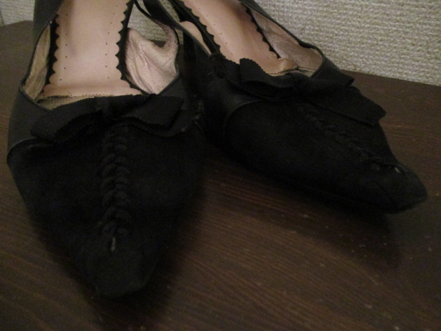 | 商品紹介 | 黒のシンプルで合わせやすいレザーパンプスです 甲部分はスエードになっていて、紐飾りもアクセントになっています。 インソール部分は光沢のある薄いピンクカラーです。 ソール部分は花柄の型押しがデザインされています。 |
