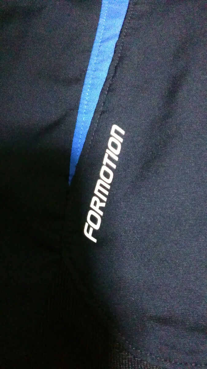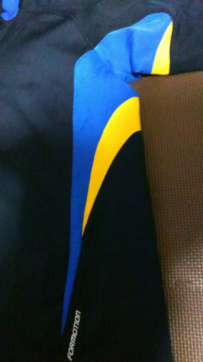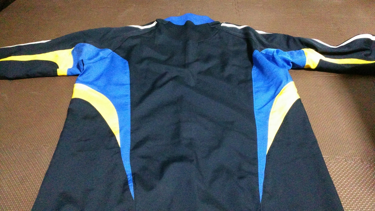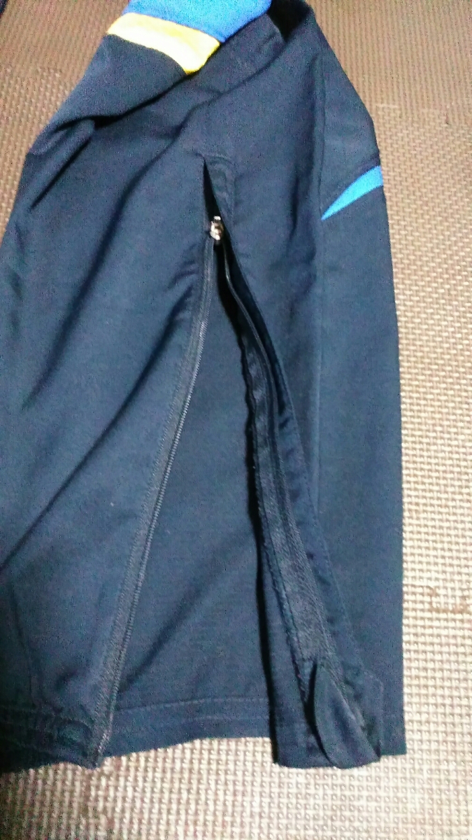 サイズ M 身幅53cm. 着丈70cm. ウエストゴム紐付き、股下75cm. 後ろチャック有り、ライン白3本青X黄色、襟、袖口、裾ゴム使用