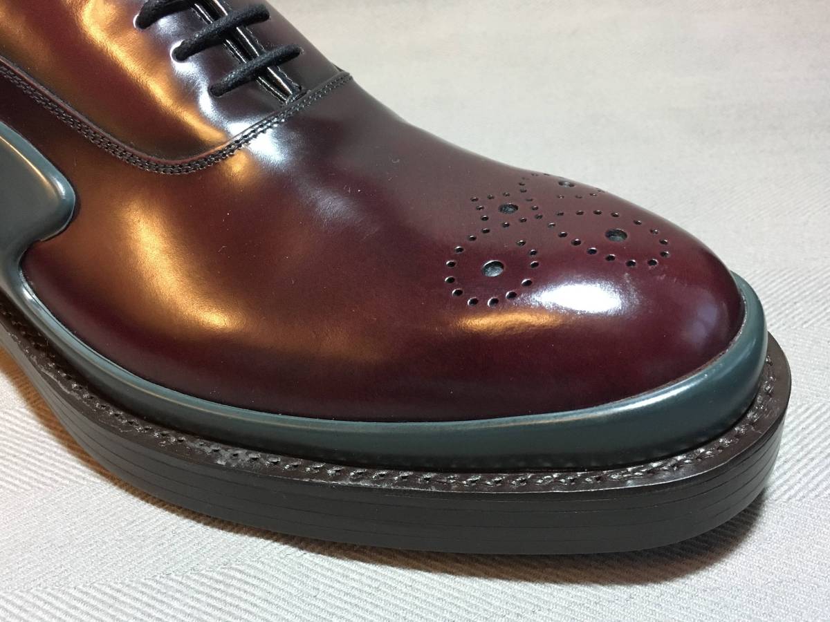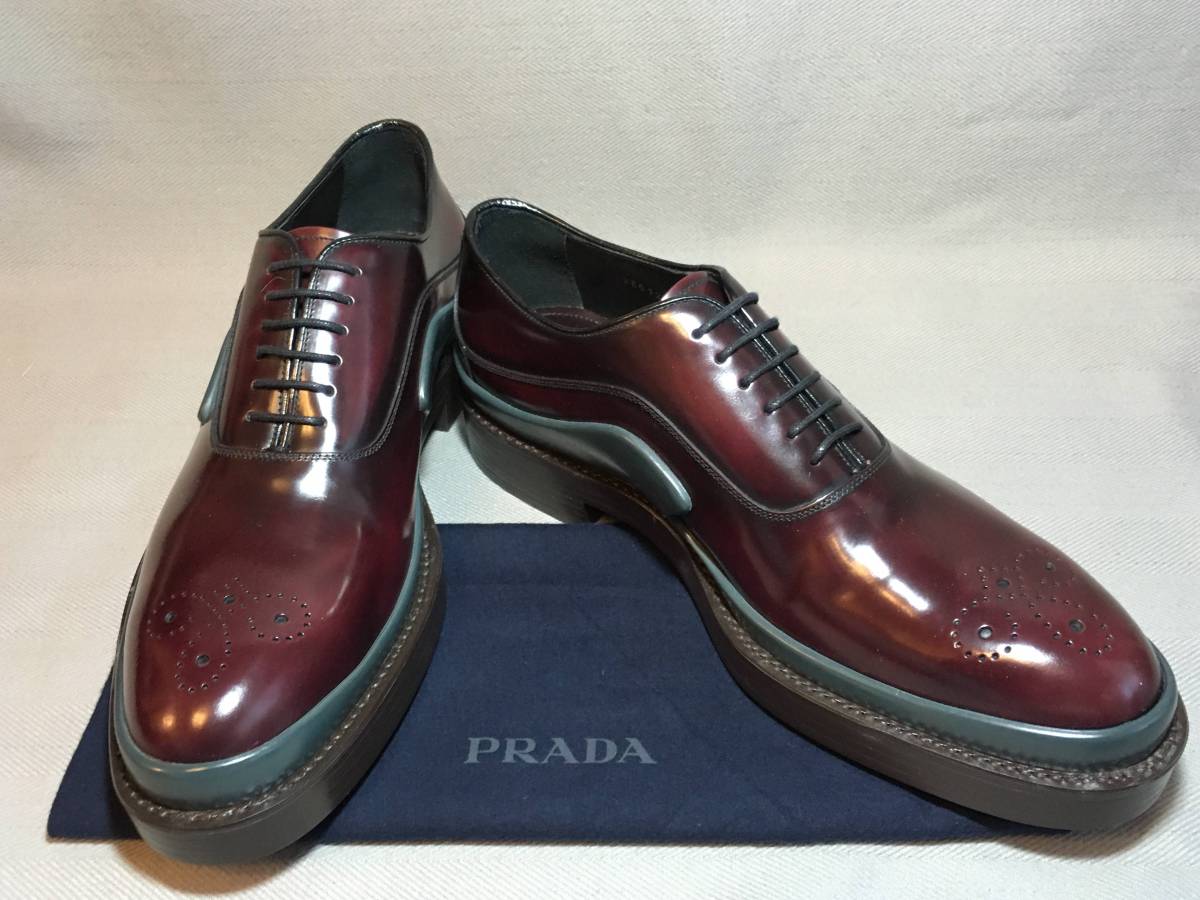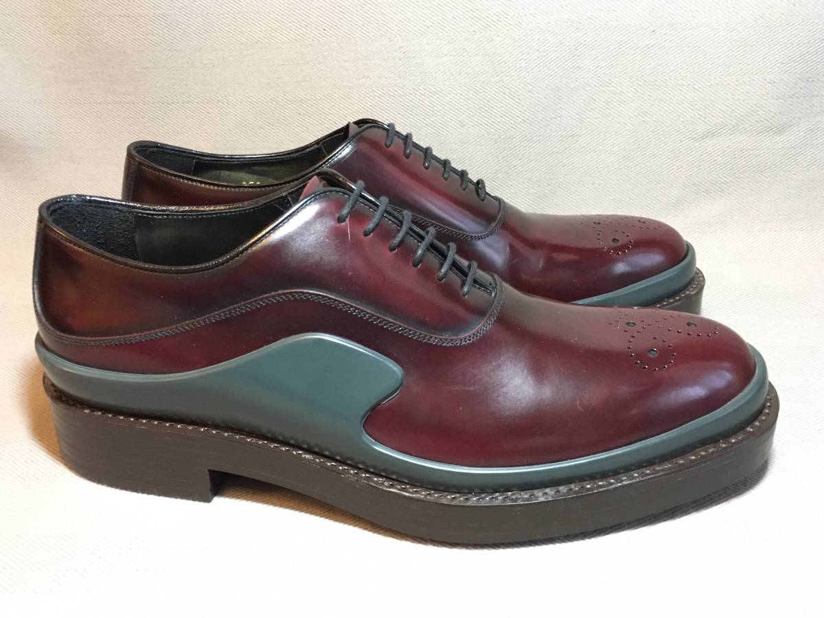 新品 本物 プラダ 15-16AW レザー メダリオン シューズ 9 PRADA 革靴 コレクション ボルドー ブラウン 茶 グレー コーティング ラバー
