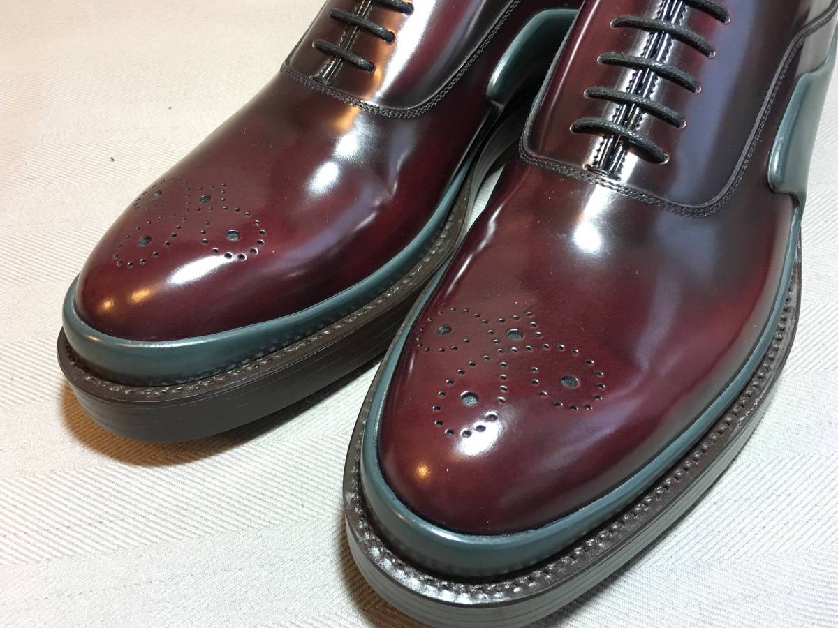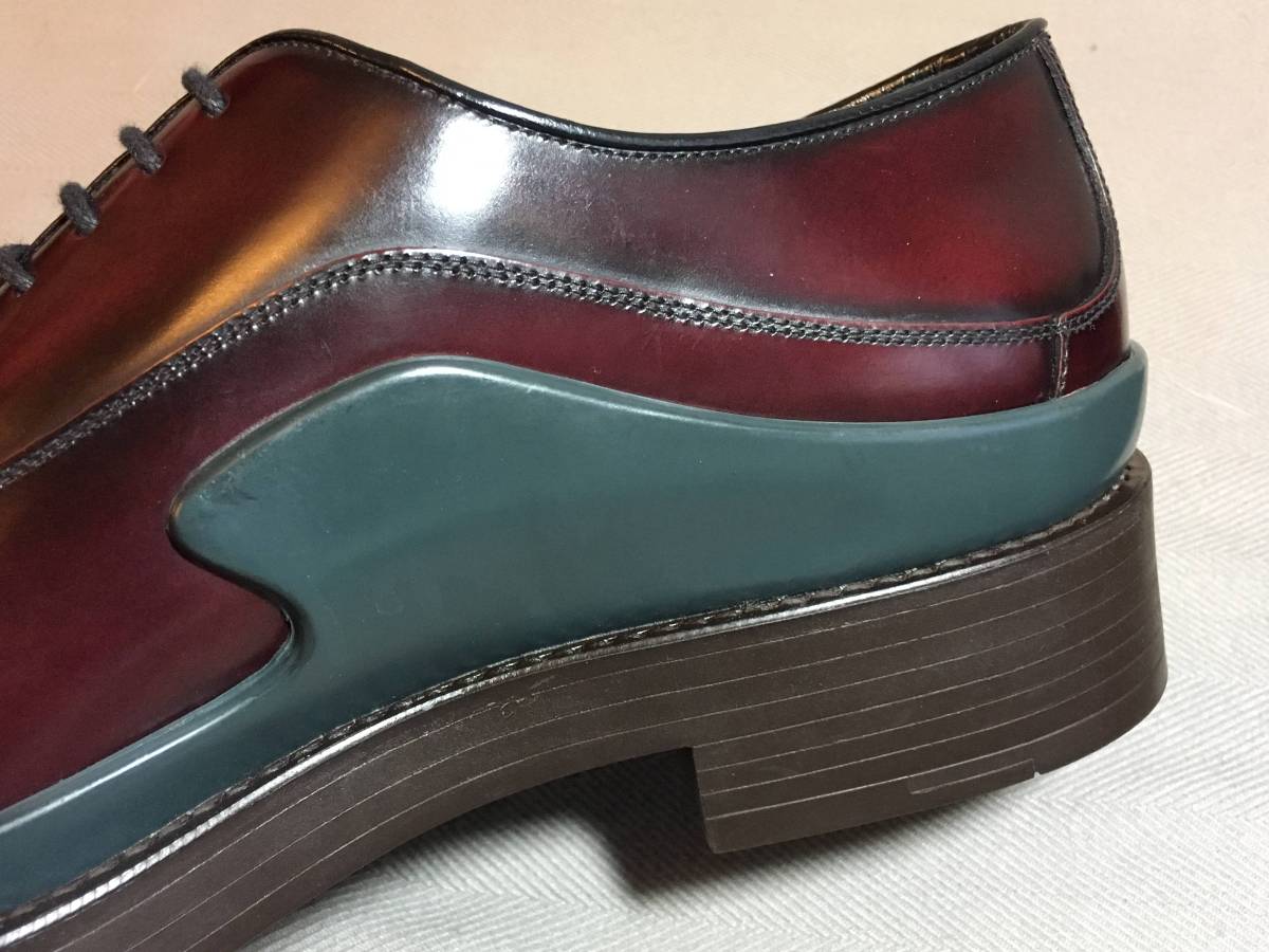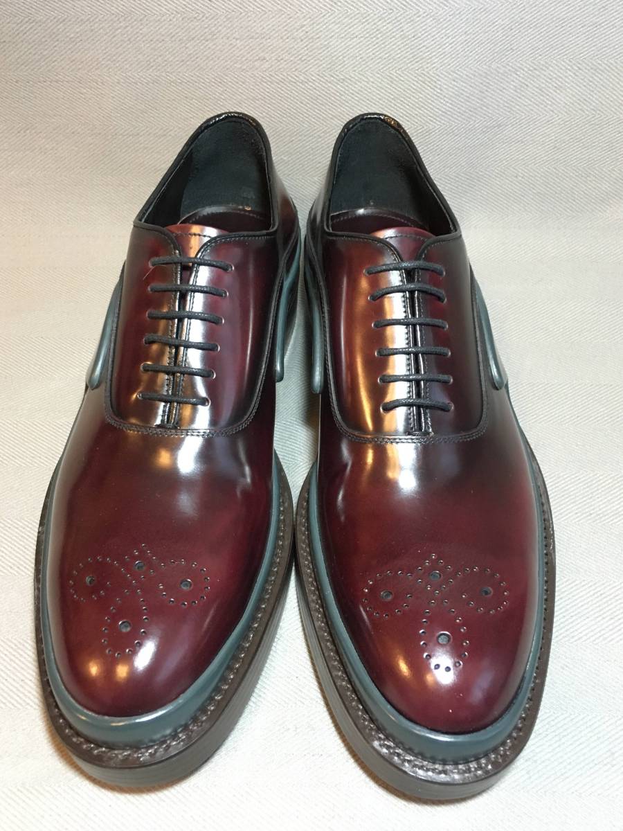 新品 本物 プラダ 15-16AW レザー メダリオン シューズ 9 PRADA 革靴 コレクション ボルドー ブラウン 茶 グレー コーティング ラバー