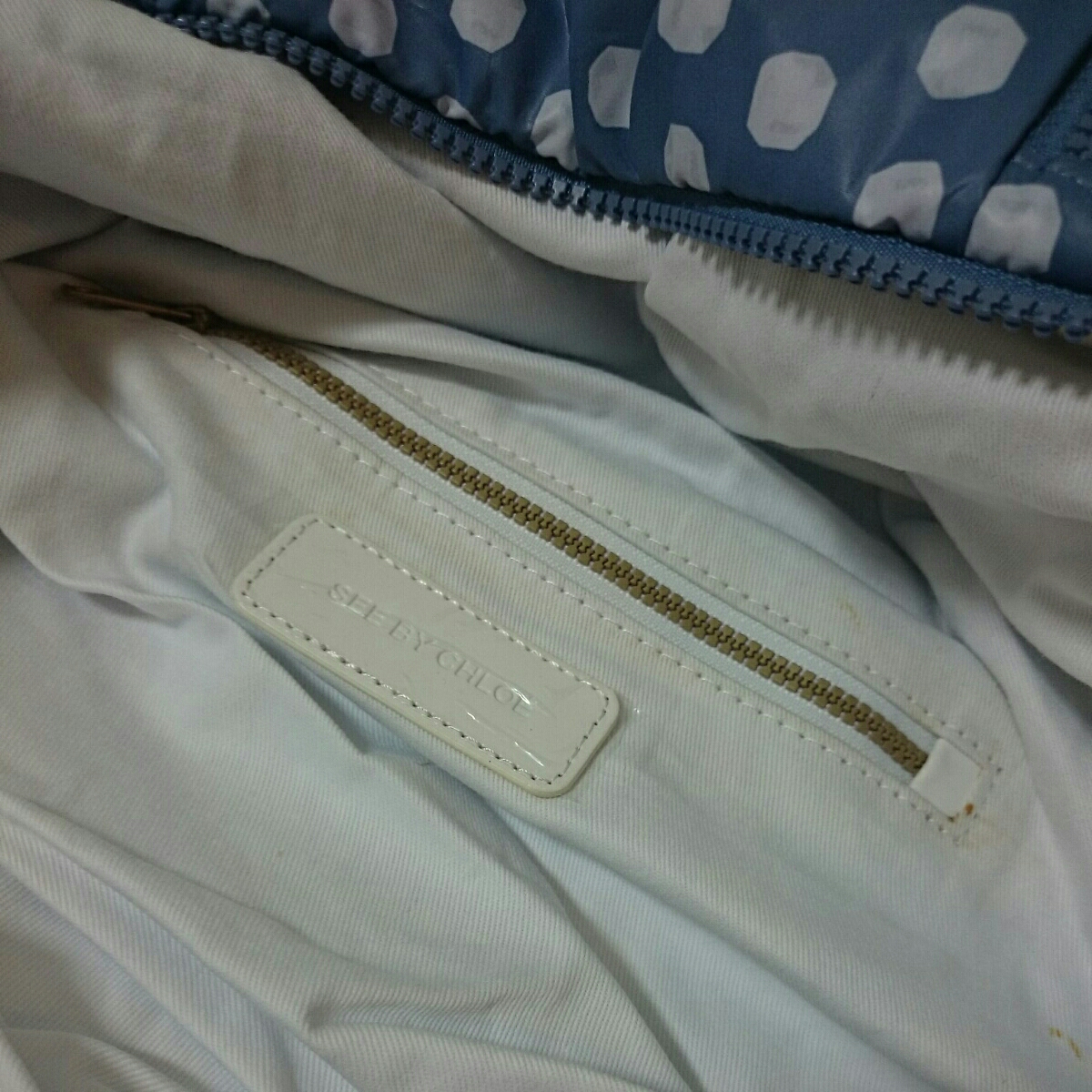 シーバイクロエのショルダーバッグ、新品です。ロゴなどは保護テープのままです。ポケットは、バッグ上部にファスナータイプが1つ、バッグ内部にファスナータイプが1つと他2つあります。内部のファスナーの周りには金属ファスナーによるシミが若干ございます、画像にてご確認ください。