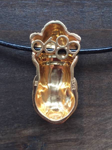 京都の犬の服屋 9689 クロパグの非売品 パグ レザー チョーカー ネックレス K18ゴールド バージョンです。