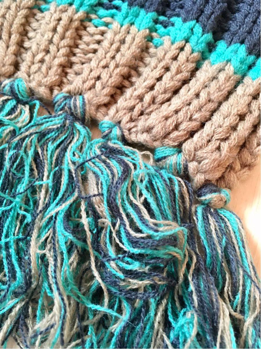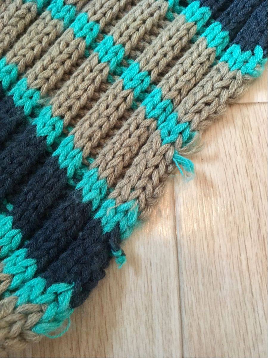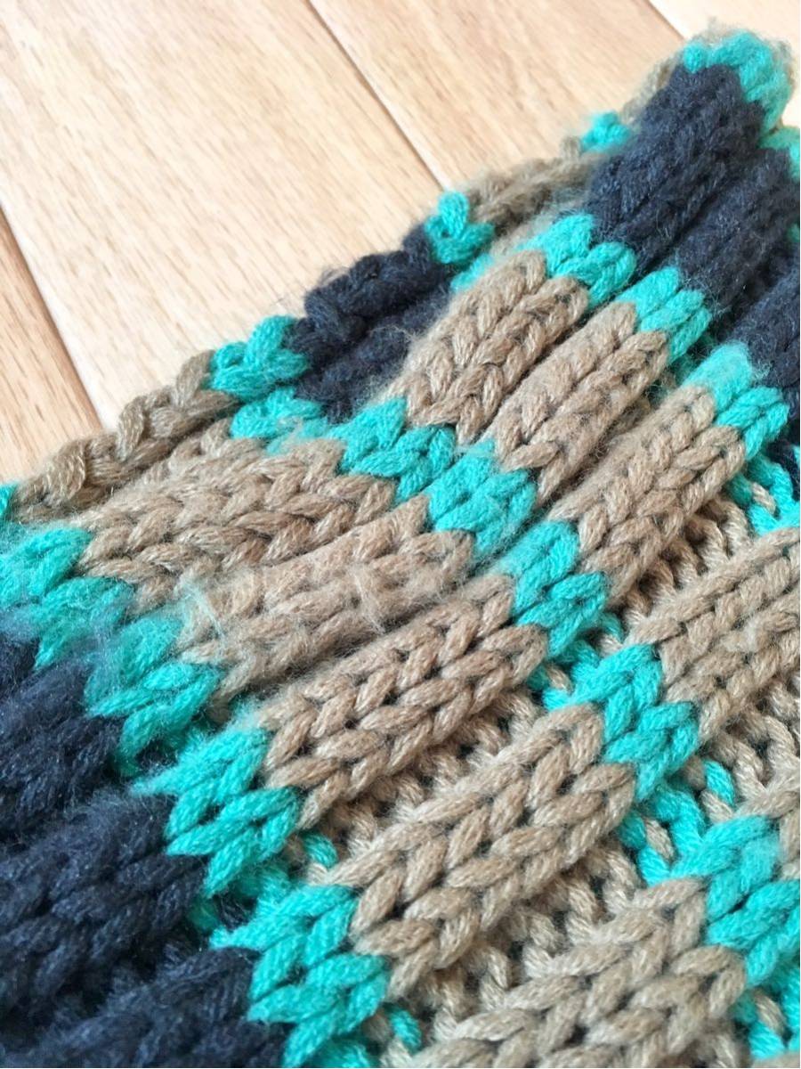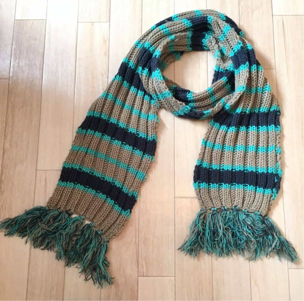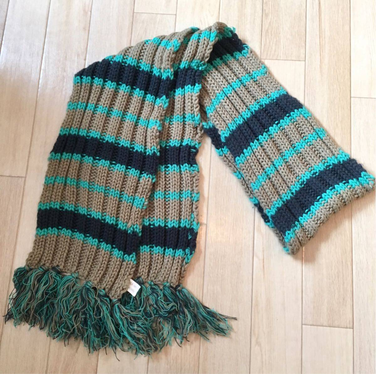 ブランドは、ブランドタグがないため不詳となりますが、ベージュ×グリーン×ネイビーのトリコロールボーダーの、フリンジ付きマフラーになります。
