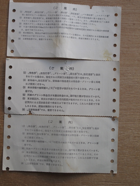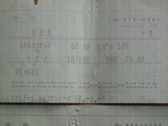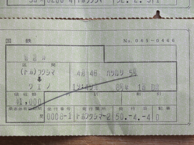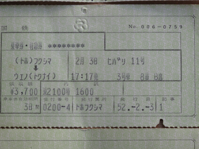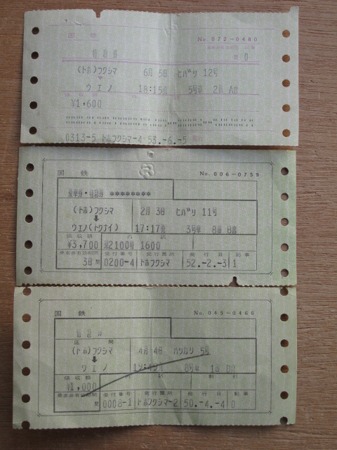 昭和50年から同53年に発行された、国鉄 特急券 乗車券・特急券 3枚 です。 ① 昭和50年4月4日の日付のある、福島駅 の発行した、同駅 から 上野駅 ゆき の はつかり5号 1000円 特急券 です。上下にミシン目。裏面に6項目の注意書き。 ② 昭和52年2月3日の日付のある、福島駅 の発行した、同駅 から 上野駅 ゆき の ひばり11号 3700円 乗車券・特急券 です。パンチ穴2か所。型押し1か所。上下にミシン目。裏面に6項目の注意書き。 ③ 昭和53年6月5日の日付のある、福島駅 の発行した、同駅 から 上野駅 ゆき の ひばり12号 1600円 特急券 です。パンチ穴1か所。型押し1か所。上下にミシン目。裏面に6項目の注意書き。 いずれも淡緑地で「こくてつ」地紋。マルス券。 サイズはいずれもタテ6.8cm×ヨコ13.9cm。 いずれも経年の変色・タテに折れ・③にホッチキス跡と右下隅に折れがあります。 定形郵便110円でお送りします。 ★保存状態の記述は、あくまで出品者の主観的な評価ですので、保存状態にきびしい方は、入札をご遠慮願います