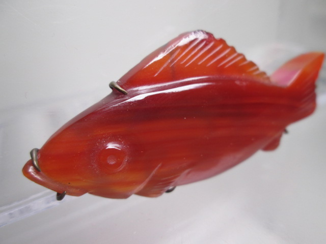 赤い縞瑪瑙を使ったカツオの帯留めです。