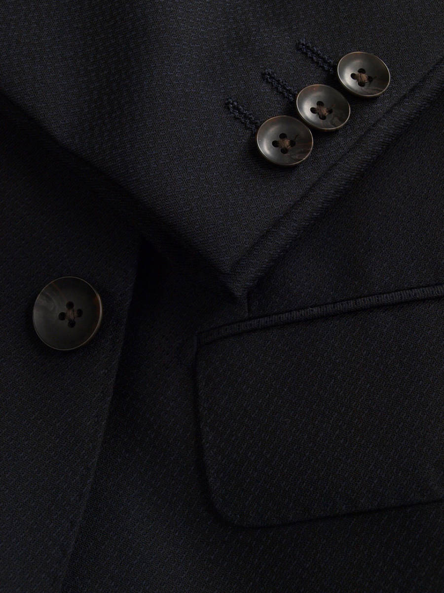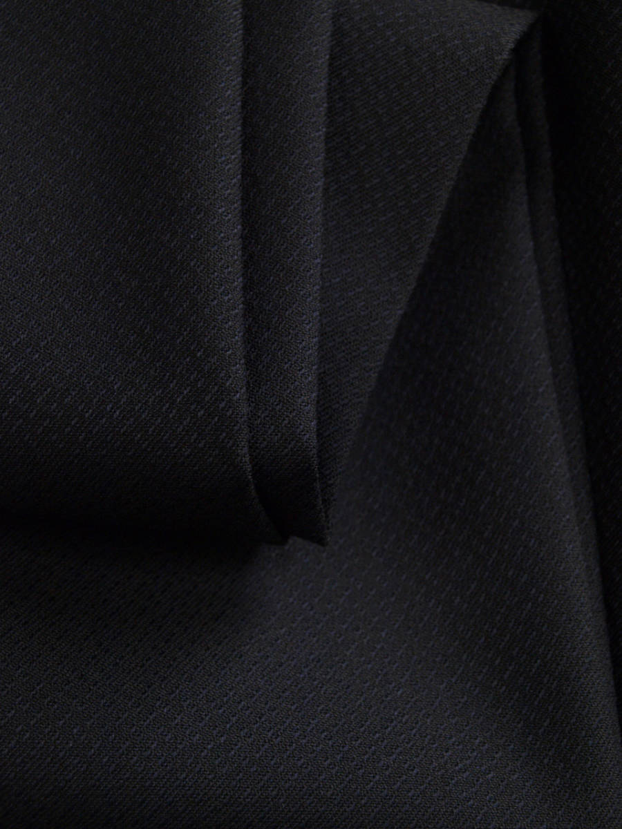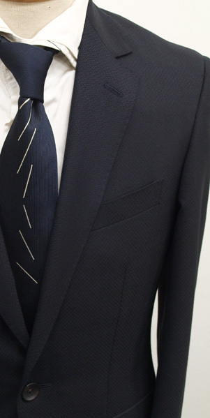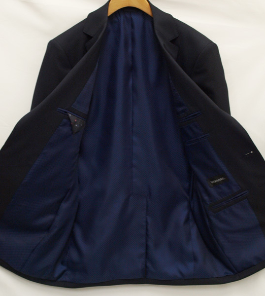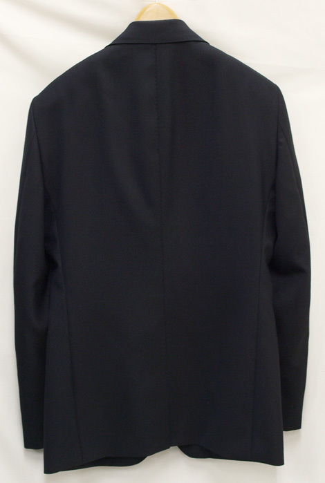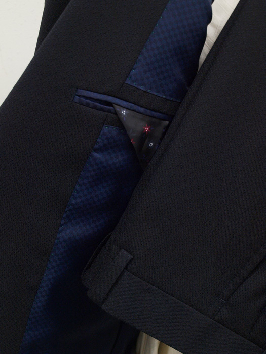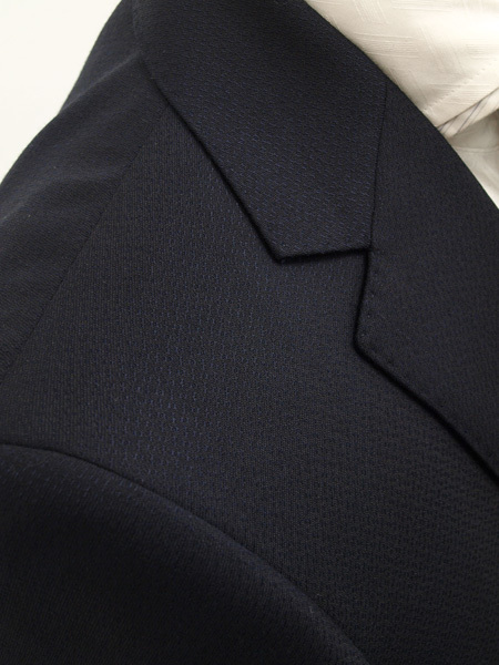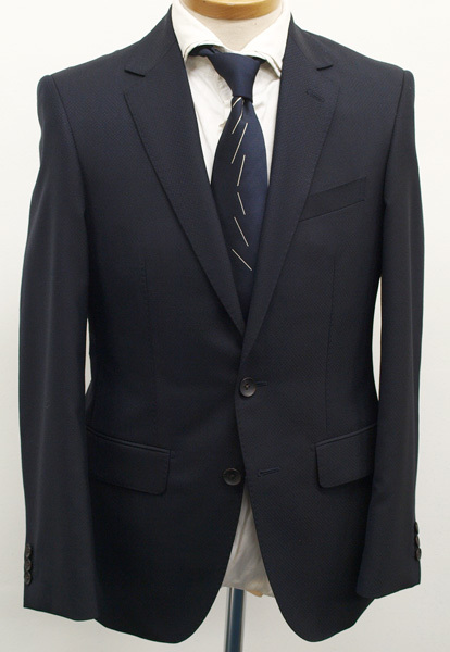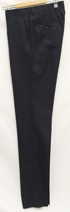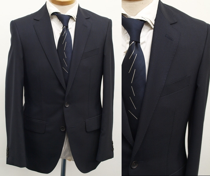 【サイズ】 BB5 (BBM/BE5号相当) 目安の体型 身長165cm~175cm、ウエストサイズ94cm前後 【ジャケット実寸】 肩幅46.5cm 着丈70.5cm 袖丈59.5cm 脇下部分54cm 身幅51.5cm 【パンツ実寸】 ウエスト(胴回り実寸)94cm (平置きでかるくはかると94cmでひっぱってはかると96cmです。股上が浅いため実寸が2~3cmほど大きめに作られております。) わたり幅33.5cm 股下から10cm下の部分30cm 裾幅19.5cm 脇股上25cm 前股上26.5cm 股下92cm(裾上げしていない状態/新品) 【デザイン】 すっきりとしたコンパクトな印象の細身シルエット、タイトフィット、スリム、ビジネススーツ新品、裾上げしていない状態です。 ・ジャケットはシングル2つボタンでスリムモデル ・パンツは股上が浅く裾巾が狭めで細いシルエットのノータックスリムテーパードパンツ 【仕様】 ・ジャケットはシングル2つボタン、ノッチドラペル、襟縁等AMFステッチ入り、袖口ボタン3つ、センターベント、内ポケット4つ(小ポケット2つ含む)、総裏(秋冬物) ・パンツはノータック、膝裏当て付き、脇ポケット斜め付け、後ろポケット両玉縁で左のみボタン付き、フロントはファスナーでボタン&ホック仕様/うちかけボタンあり こまかい部分まで細部にわたりきちんとしたビジネス仕様の縫製仕立てで仕上がっております。 【素材】 表地:ウール50% ポリエステル50% 裏地:胴裏/ポリエステル100% 袖裏/ポリエステル100% 【色】 濃紺色 【柄】 こまかい織柄入り 冬向けの中ではそれほど厚みのない適度な厚みの秋冬向け紳士スーツ用のウールブレンド素材を使用 秋~冬~春先にかけて秋冬メインのシーズン対応商品