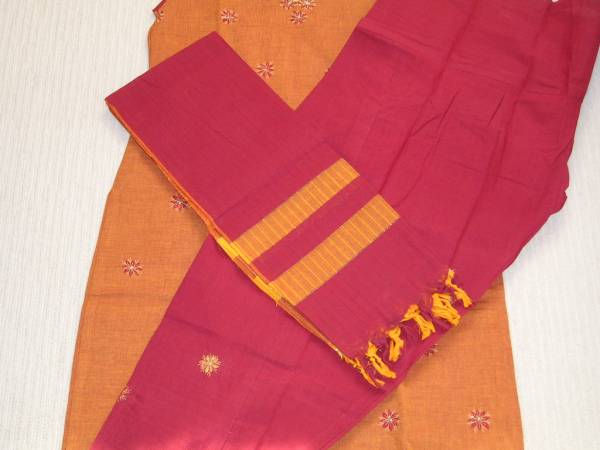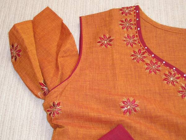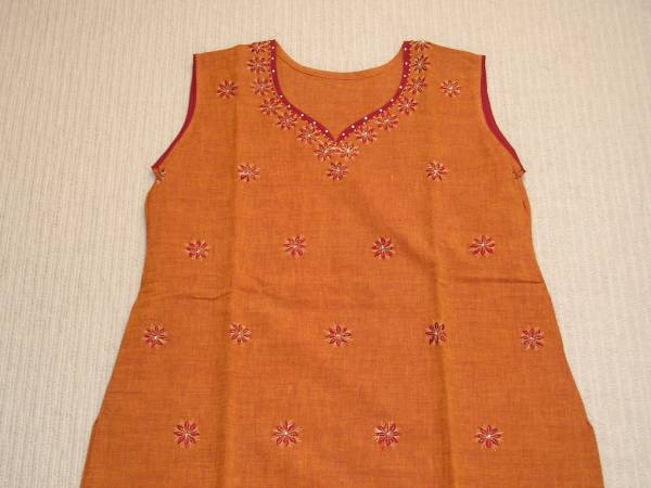 さっくりした感触のコットン地のパンジャビスーツです。ちょっと落ち着いた色合いのオレンジ色のコットン素材の長めの丈のワンピースとワインレッドのコットン地のパンツ、ストールの3点セットです。ワンピースはノースリーブ仕立てになっていますが、お好みで半袖にも変更可能になっています。お店のインドの女性のアドバイスでは、“ノースリーブの下に好みの色のTシャツを着て色を合わせると素敵”との事。パンツもゆったりサイズの紐バンド式です。ワンピースのサイズは肩幅約39センチ、身幅約48センチ、着丈約98センチ、脇のスリットが約48センチです。9号から11号くらいの方に合うと思います。シンガポールのリトルインディアにある専門店で購入してきた新品です。