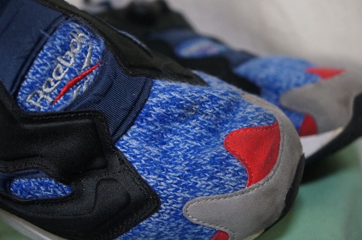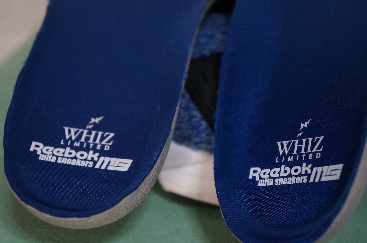 生誕20周年を迎えたハイテクスニーカーの"インスタ ポンプ フューリー(INSTA PUMP FURY)"をベースに採用。昨年ミタスニーカーズが手掛けた"フィッシャーマンニット"を彷彿させる、柔らかな風合いのニット地をアッパーに使用。青を基本色に置くことで、爽やかな印象に仕立て上げている。ポンプブラッダーやヒールカウンターは、落ち着きのある黒とネイビーをあしらい、つま先はグレーとレッドの補強パーツを配置。今回はコラボレーションモデルということで、プルタブやヒールにWHIZのブランドロゴが刺繍で入る。またインソールは通常のモノに加え、コルクバージョンの2種類が付属したスペシャル仕様となる。
