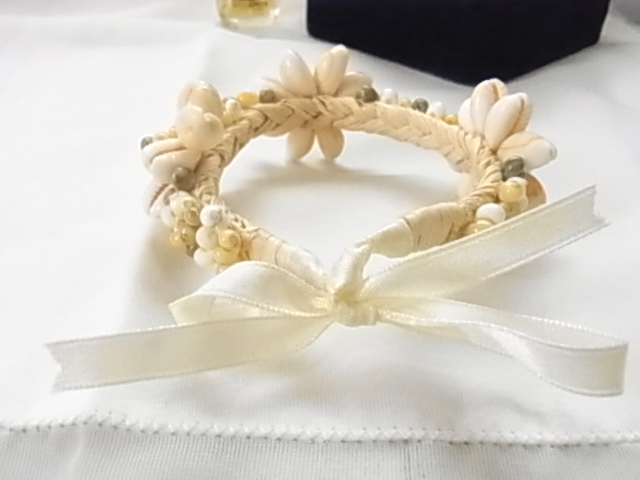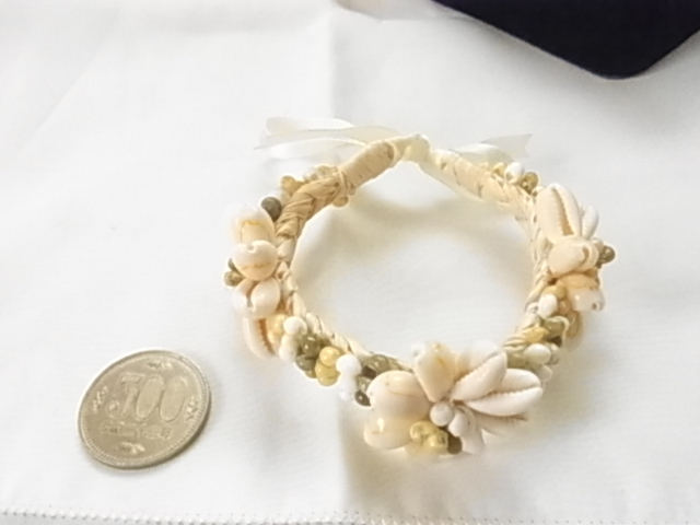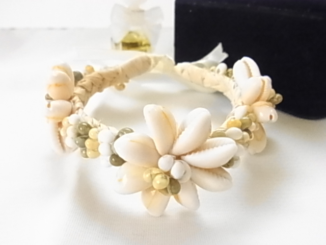 可愛いお花のデザイン シェル調のビーズ使い リボンで結ぶ ブレスレット★