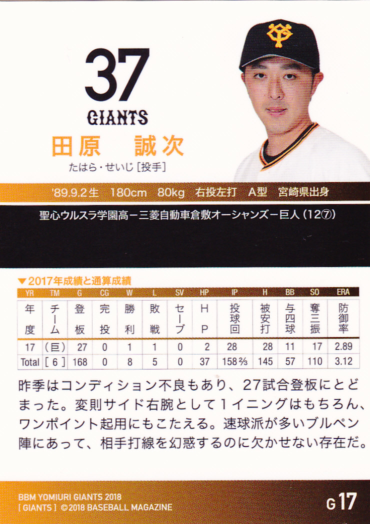 BBM2018 読売ジャイアンツ G17 田原誠次 巨人 宮崎県 聖心ウルスラ学園高校