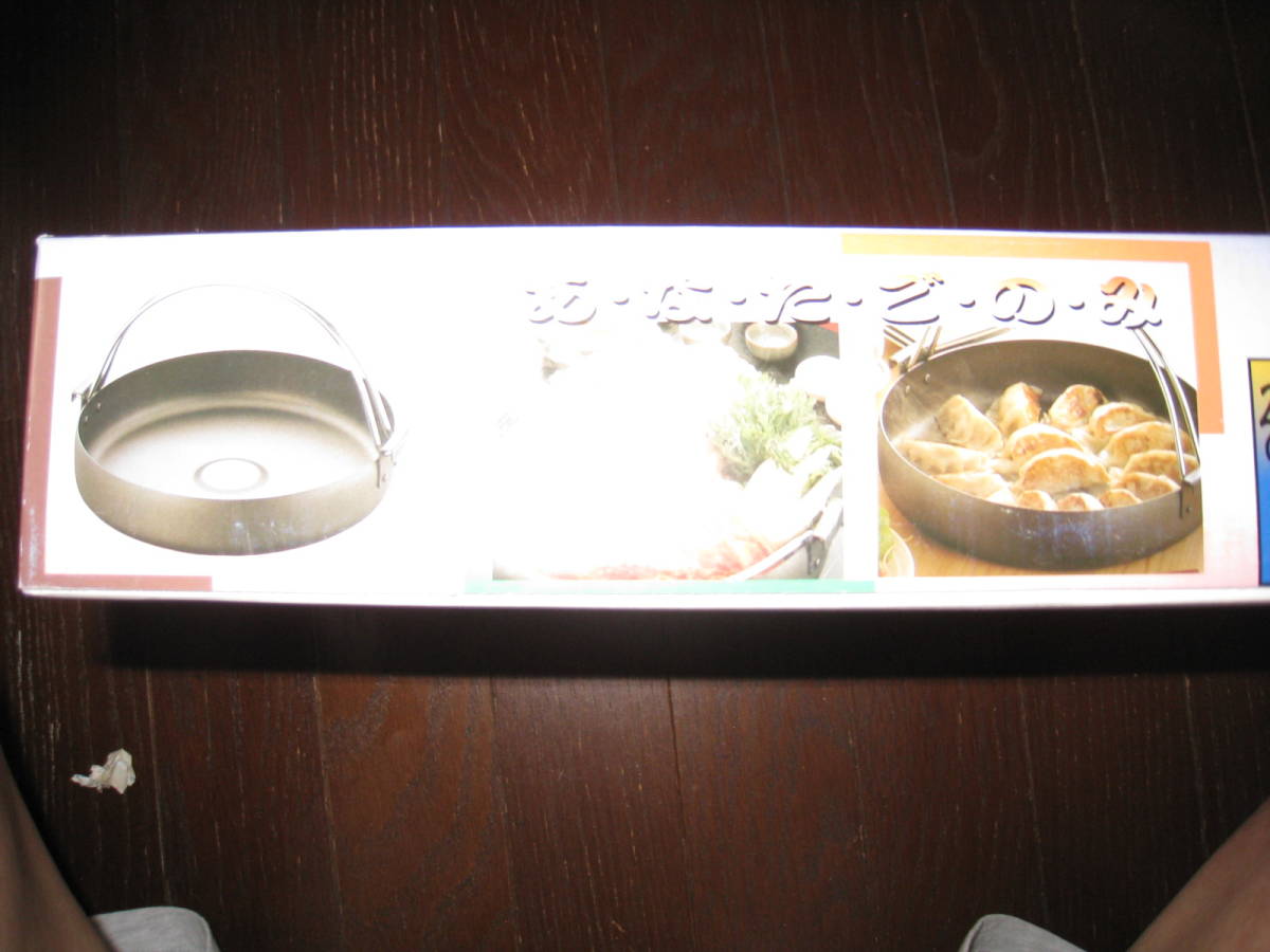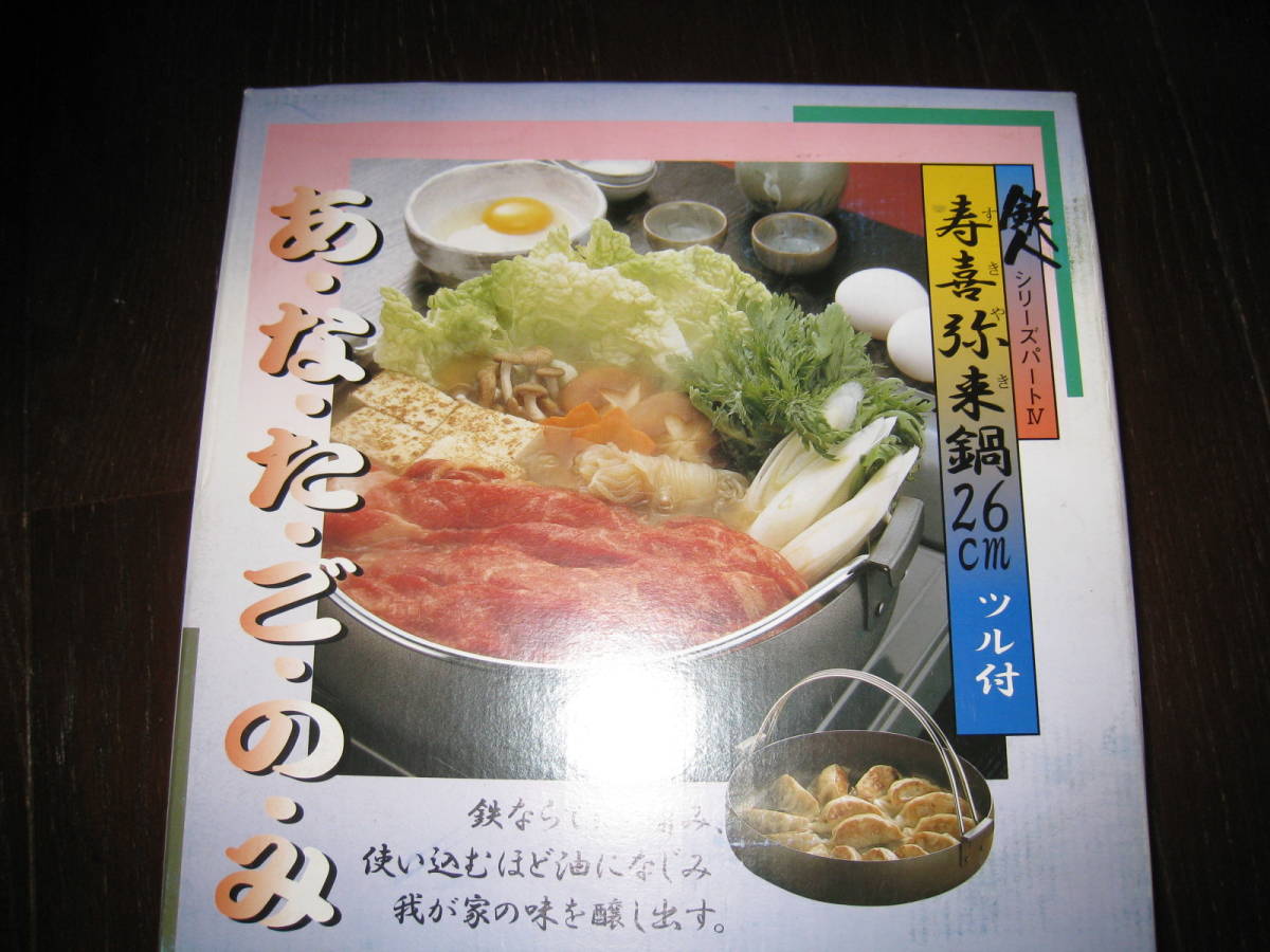 オーソドックスなツルのついたすき焼き鍋。今はやりの鉄分が補えるという鉄製。大きさ26cm、新品箱入り。箱入り重量1.2kg、宅配サイズ80。 |