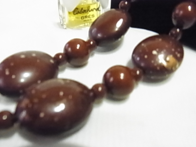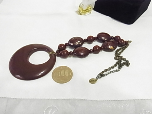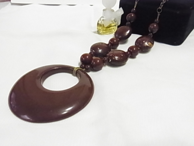 cloires刻印 チョコ茶ブラウン 大きめの塗りのビーズ玉 楕円玉には和モダン風の模様入り ネックレス▼