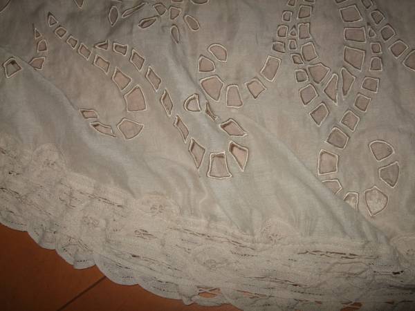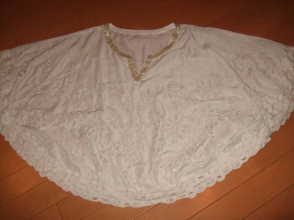 良品、GRACE CONTINENTALの系列ブランドのGRACE CLASSのお品です。素材はポリエステル100、パテンレースや、首元のスパンコール、カットレースなどデコラティヴなデザインがとてもステキです。身幅焼く46、裾、から袖がつながった変形デザインのタイプのものですが、とてもエレガントです。お色はアイボリー系で少しベージュっぽいニュアンスがあります。ポンチョのようなデザインで、着こなしが これ1枚でおしゃれになるアイテム、涼しいので、暑い暑い夏におしゃれ感を出すにはおすすめです。アクセサリーいらずのデコラティヴさなのも、暑い夏にはおすすめです。繊細な素材感なので、大きな難などは見受けられませんが神経質な方はご遠慮ください。時々着用していた感じですので、大きなユーズド感はありません。