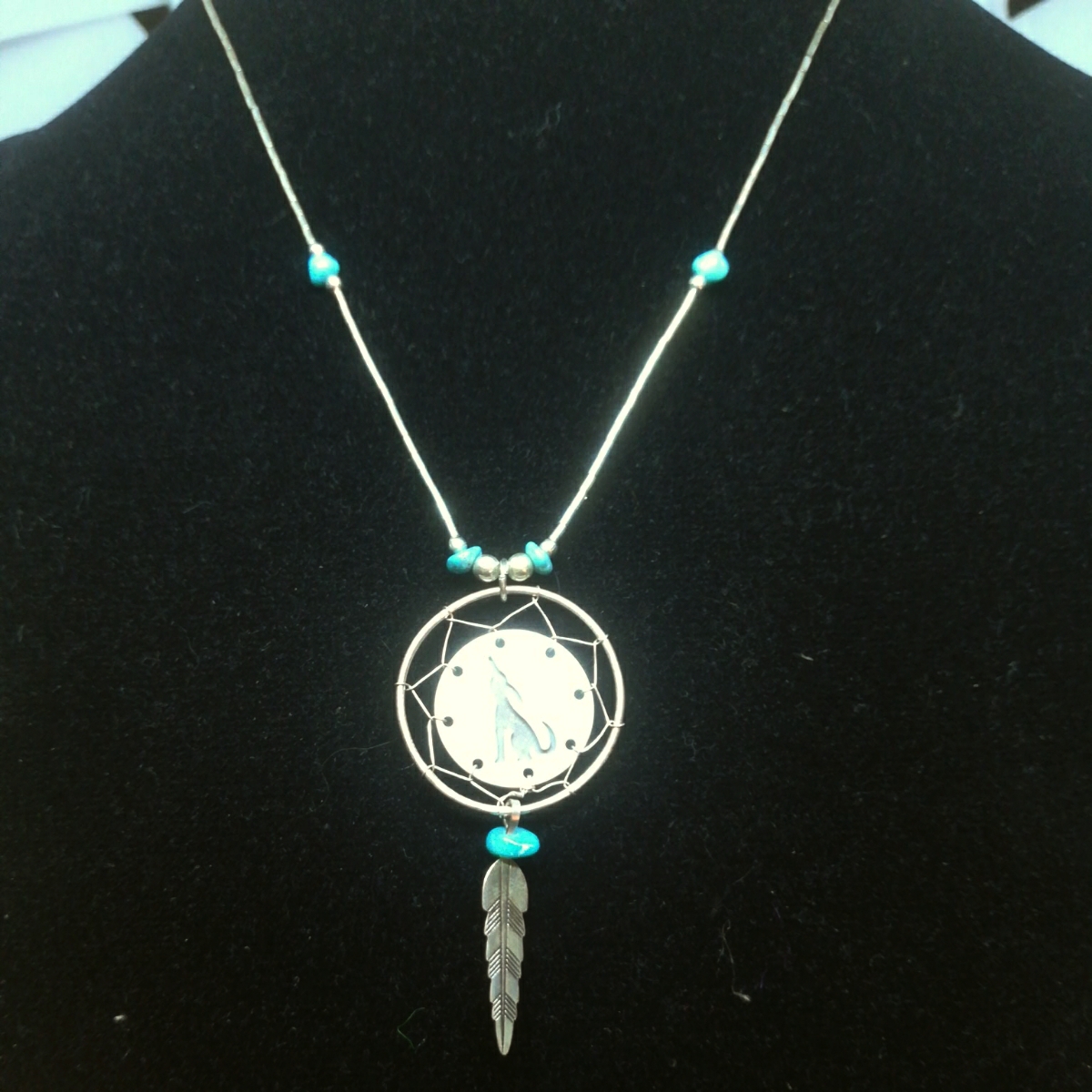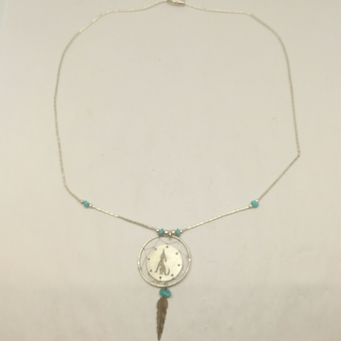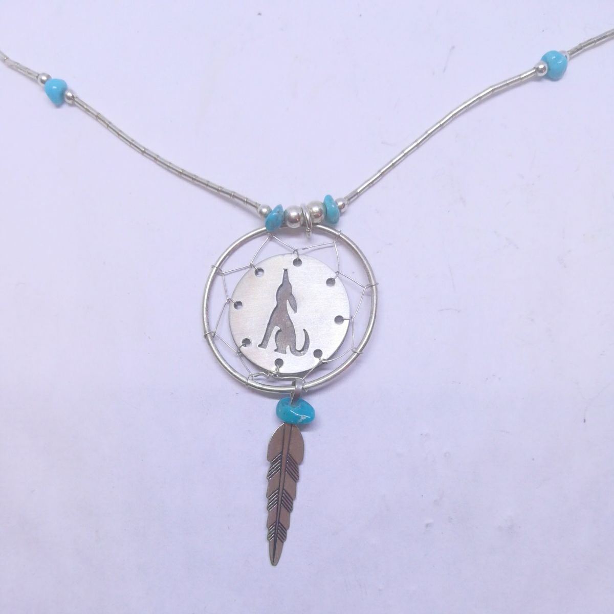 コヨーテ 御用邸とドリームキャッチャーが施されたトルコ石月のネックレスです シルバー925