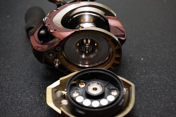 左のカバーを下にひねることによりベアリング交換、掃除などメンテナンスOK!