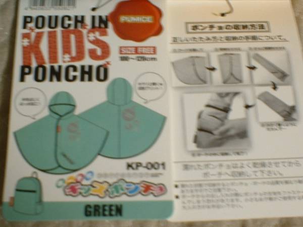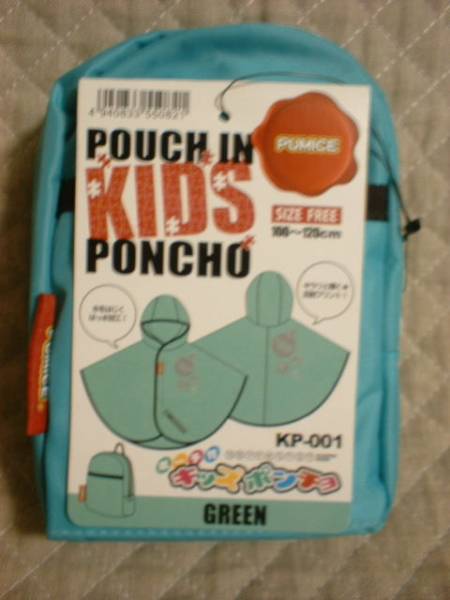 定価1598円。フック付きポーチ。キッズポンチョ。PUMICE。男女兼用。サイズ:100~120㎝(フリーサイズ)