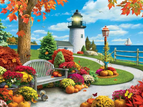31576 MAS 750ピース ジグソーパズル 米国輸入 穏やかで豊かな、詩的な秋の海辺の光景 海辺の灯台 カボチャ 紅葉 帆船 Alan Giana