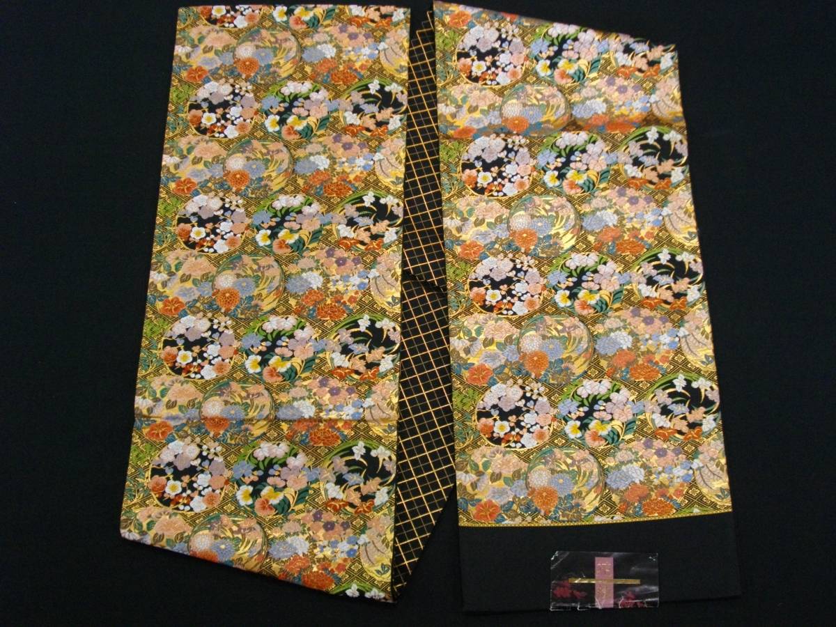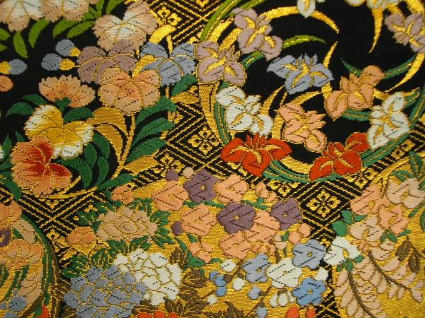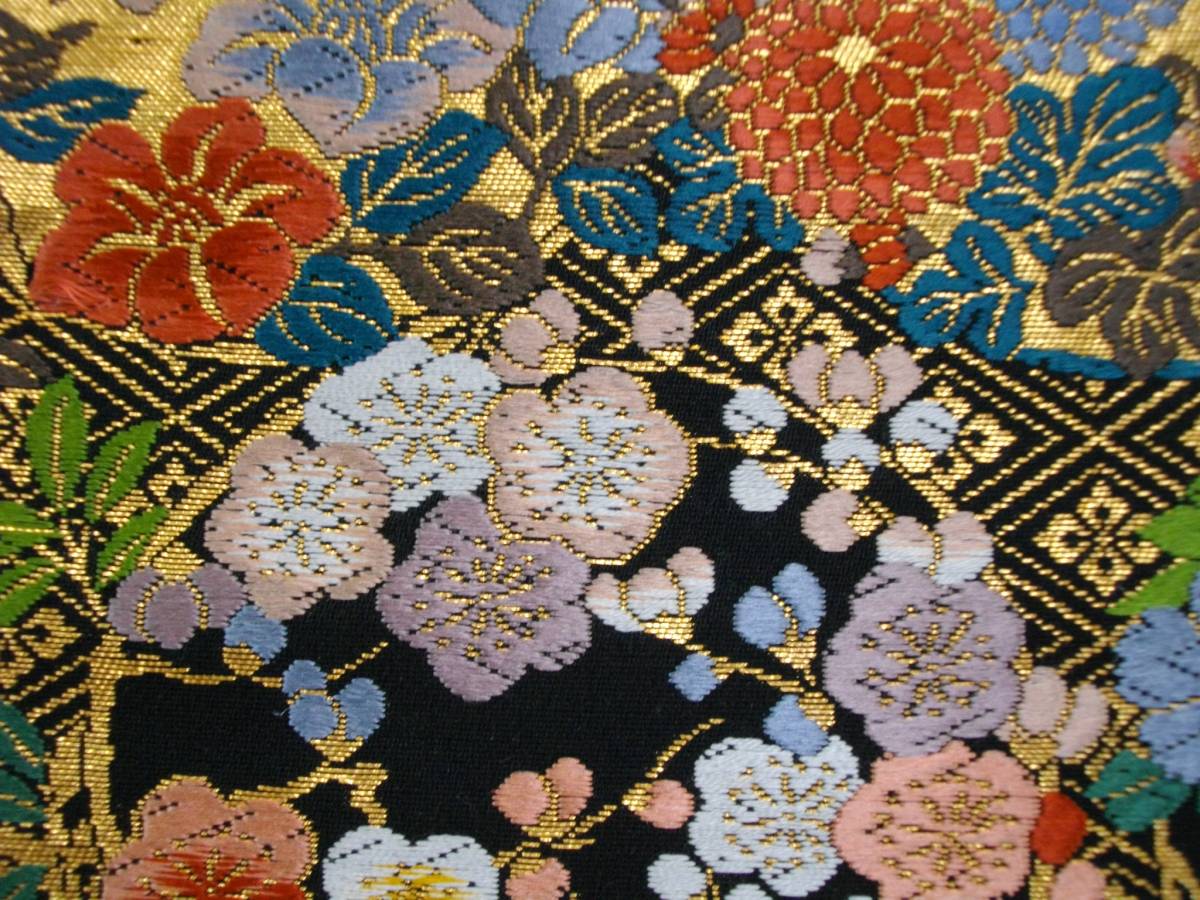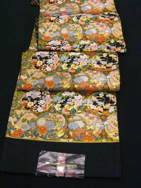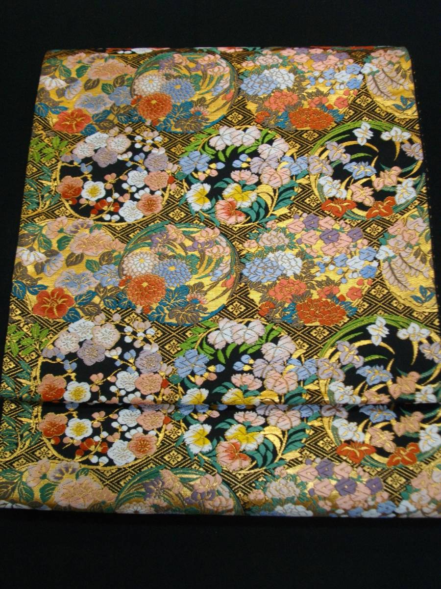黒地に金の地紋、柄の花々には多くの色糸が使われていて非常に華やかな帯です。花は四季折々のものが揃っており、季節を特定する様なものではありませんので1年を通して、真夏以外全てに使えます。