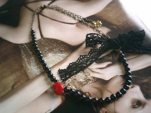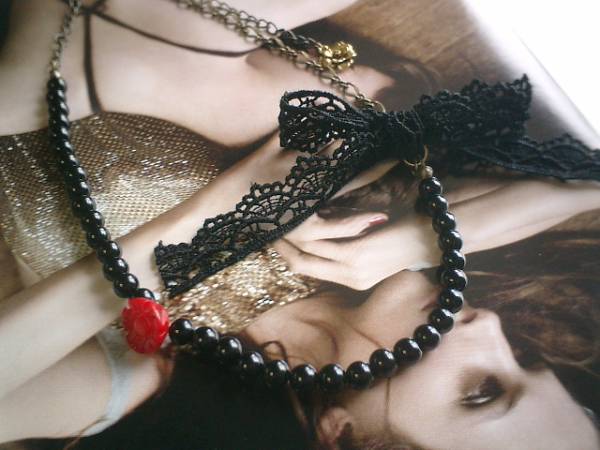 センチメンタルシリーズです♪少女モード入りました!オニキスと黒の綿レースのキュートで可愛いネックレスです♪オニキスは8ミリの丸玉です♪14ミリ位の赤珊瑚のお花と黒の綿レースを合わせて大人のロマンチックしています♪長さは全長55センチ位で調節自由です♪黒の綿レースは取り外し出来ます♪チョーカー風に着けても素敵です♪お揃いのブレスレットや同じタイトルのシリーズも出品しています♪シンプルで飽きのこないいつまでも着けられるデザインを考えて作りました!ハンドメイドをご理解頂いてノークレーム、ノーリターンでお願いします