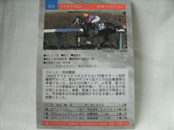 | ☆☆☆商品説明☆☆☆ 【メーカー】 バンダイ 【シリーズ】 96年上半期サラブレッドカード 【番号】 013 アミサイクロン 【数量】 1枚 サラブレッドカードの第2弾96年上半期カードになります。 |