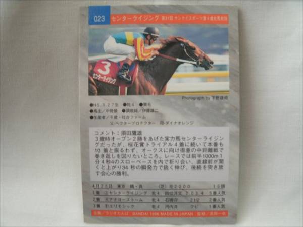 | ☆☆☆商品説明☆☆☆ 【メーカー】 バンダイ 【シリーズ】 96年上半期サラブレッドカード 【番号】 023 センターライジング 【レース】 第31回サンケイスポーツ賞 4歳牝馬特別 【数量】 1枚 サラブレッドカードの第2弾96年上半期カードになります。 |