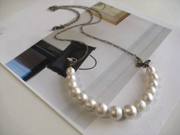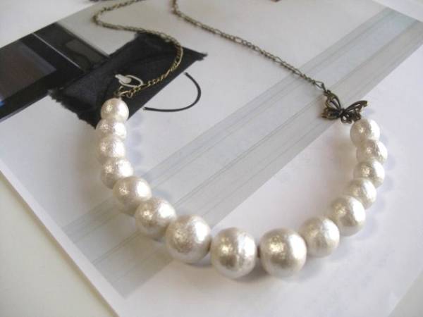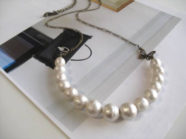 特別な一日・・シリーズです♪コットンパールと小さな蝶・・ふんわりやさしいオフホワイトのコットンパールのネックレスです♪軽い着け心地で楽しんでいただけます♪丸玉のパールに小さな蝶のメタルチャームを合わせてロマンチックな表情です♪10ミリ、14ミリの丸玉のパールに15ミリ位の蝶です♪長さは全長90センチ位で調節自由です♪お揃いのブレスレットやイヤリングも出品しています♪シンプルで飽きのこないいつまでも着けられるデザインを考えて作りました!ハンドメイドをご理解頂いてノークレーム、ノーリターンでお願 いします