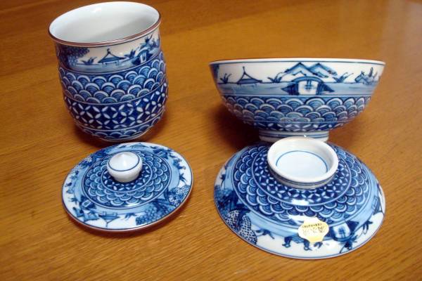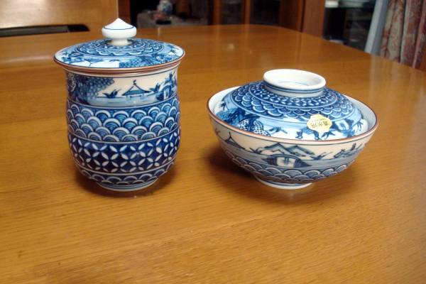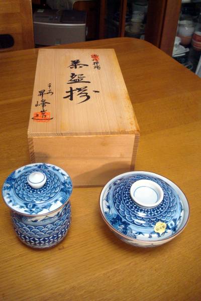 清水焼 平安昇峰(伊藤昇峰)染付祥瑞の茶碗と湯呑のセットの未使用品です。染付の絵柄がとても渋くて素的です。