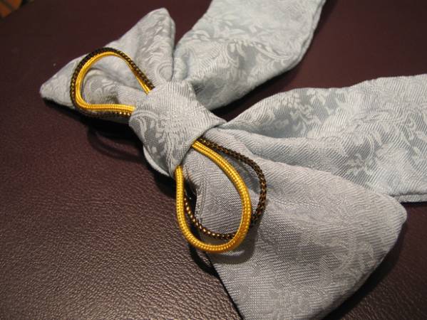 水色に唐草のような地紋の生地、黄色と黒金の紐飾り。