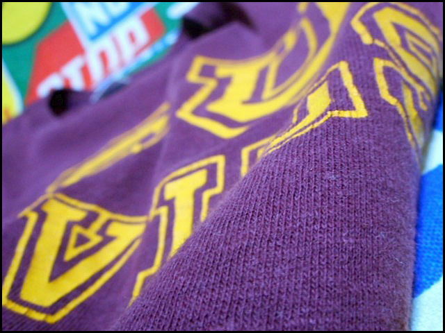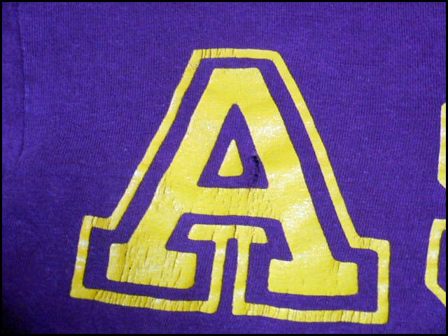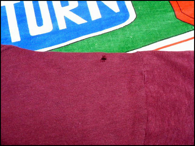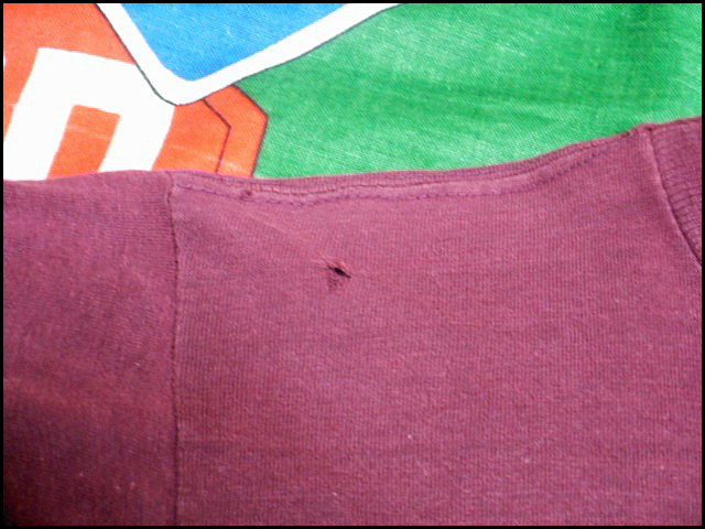向かって左肩、プリント「A」部分に小穴が計4カ所見られます。その他、USED相応の着用感があります。