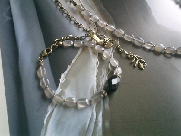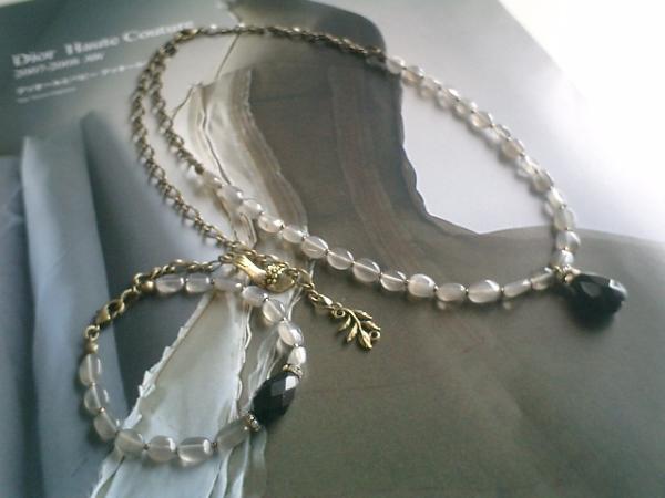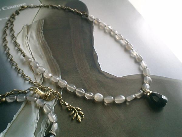 美術館をイメージして♪アンニュイ(?)な雰囲気のネックレスとブレスレットを作りました♪パリ(??)っぽいアンティークな雰囲気で作りました。繊細な美しさのグレームーンストーンは6×8ミリ位のオーバルです♪トップのオニキスは13×10ミリ位のドロップカットです♪ジルコニアのロンデムでおめかししました♪アンティークチェーンを合わせてシックにロマンチックしています♪ネックレスの長さは全長60センチ位で調節自由です♪ブレスレットの長さは16センチ+アジャスター5センチで最長21センチ位です♪飽きのこないいつまでも着けられるデザインを考えて作りました!ハンドメイドをご理解頂いてノークレーム、ノーリターンでお願いします
